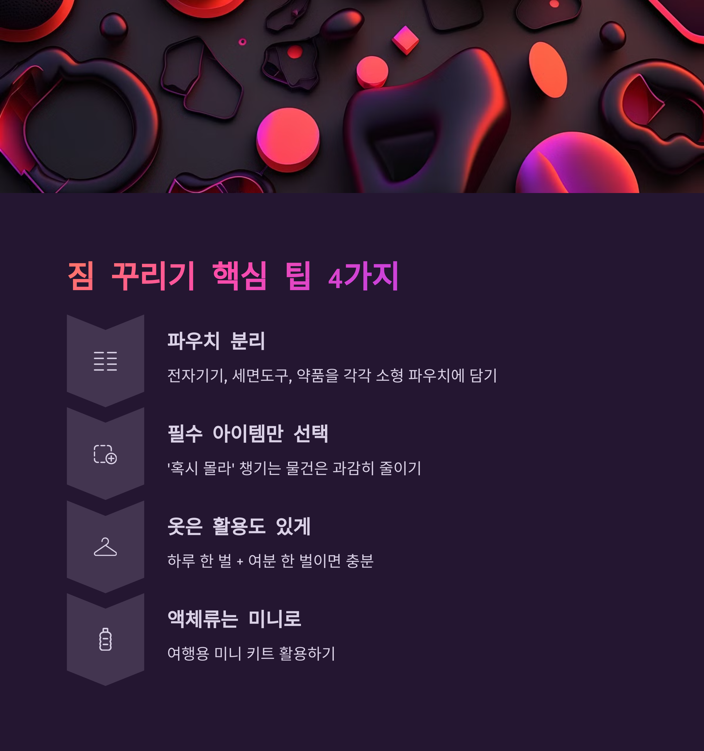 - 필수 아이템만 선택: '혹시 몰라' 챙기는 물건은 과감히 줄이세요.