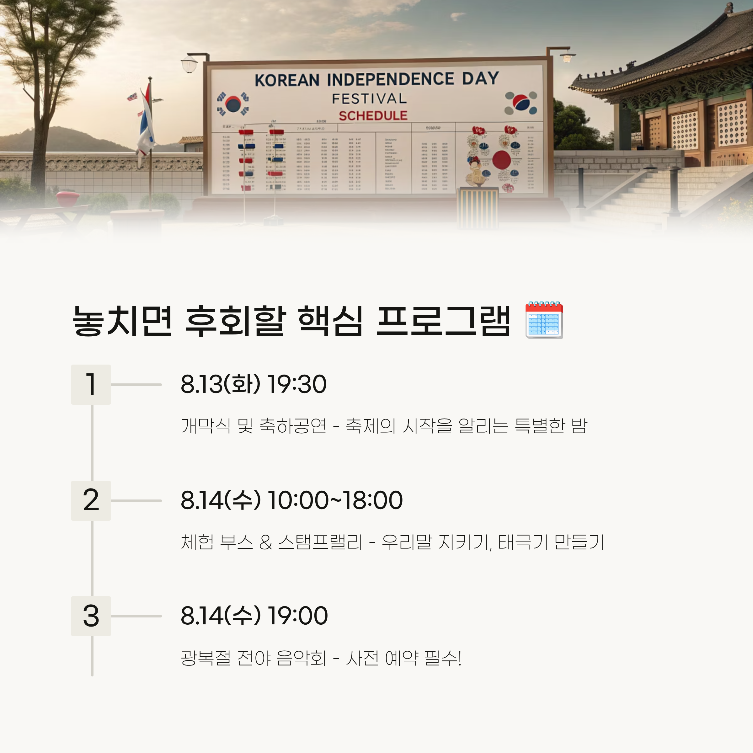 | 8.14(수) 19:00 | 광복절 전야 음악회 | 광복의 감동을 음악과 함께 | 사전 예약 필수 |