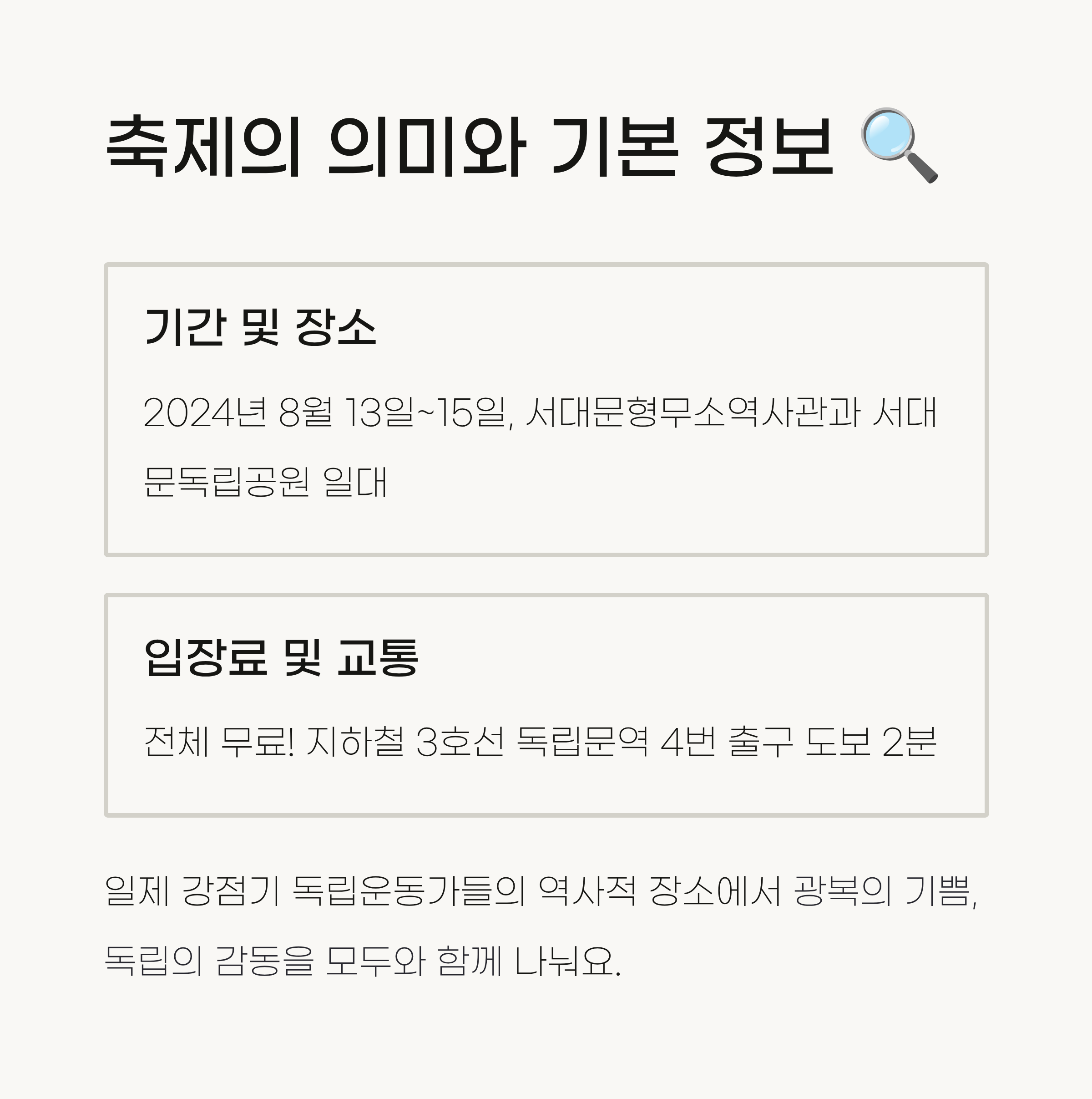 이번 2024 서대문 독립민주축제는 단순히 즐기고 끝나는 행사가 아니라, 우리 모두의 마음속에 광복의 의미를 다시 한번 새기는 소중한 시간이 될 거라고 생각해요. 이 글이 여러분의 축제 준비에 큰 도움이 되었으면 좋겠습니다. 😊