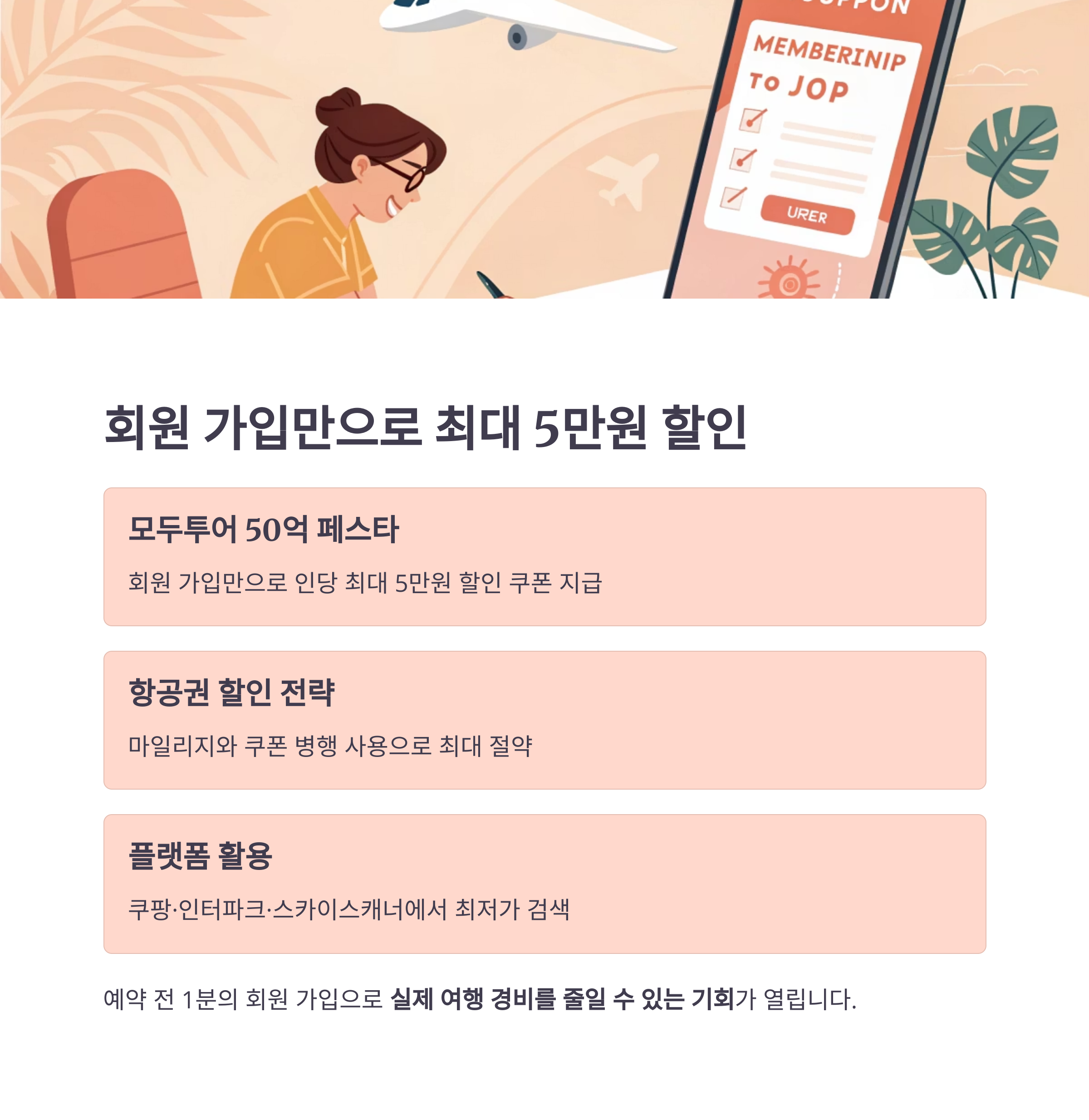 "예약 전, 단 1분의 회원 가입만으로도 실제 여행 경비를 줄일 수 있는 기회가 열립니다."