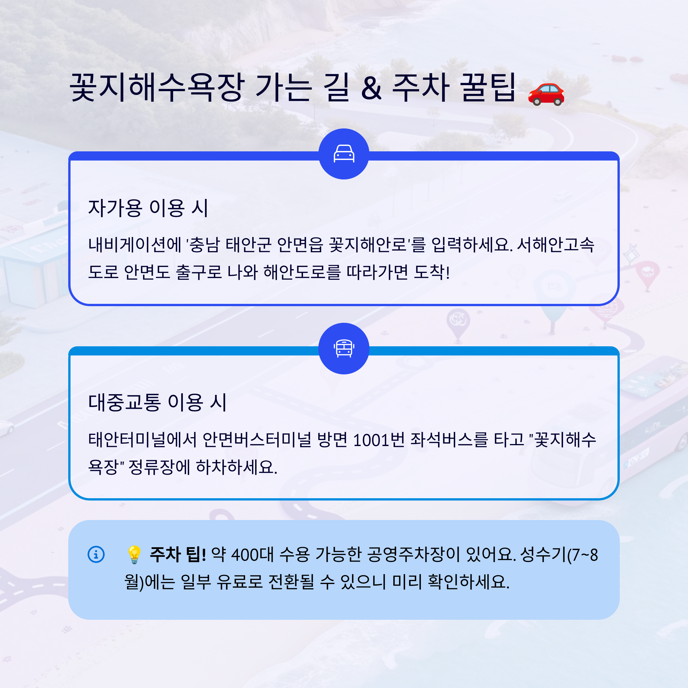 인근에 약 400대를 수용할 수 있는 넓은 공영주차장이 마련되어 있어요. 성수기(7~8월)에는 일부 유료로 전환될 수 있으니 미리 확인해 보세요.