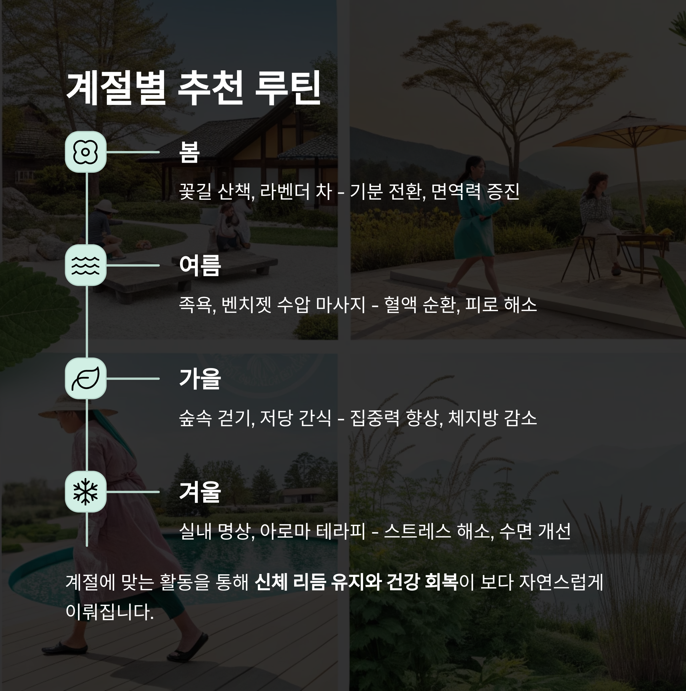 | 봄 | 꽃길 산책, 라벤더 차 | 기분 전환, 면역력 증진 |