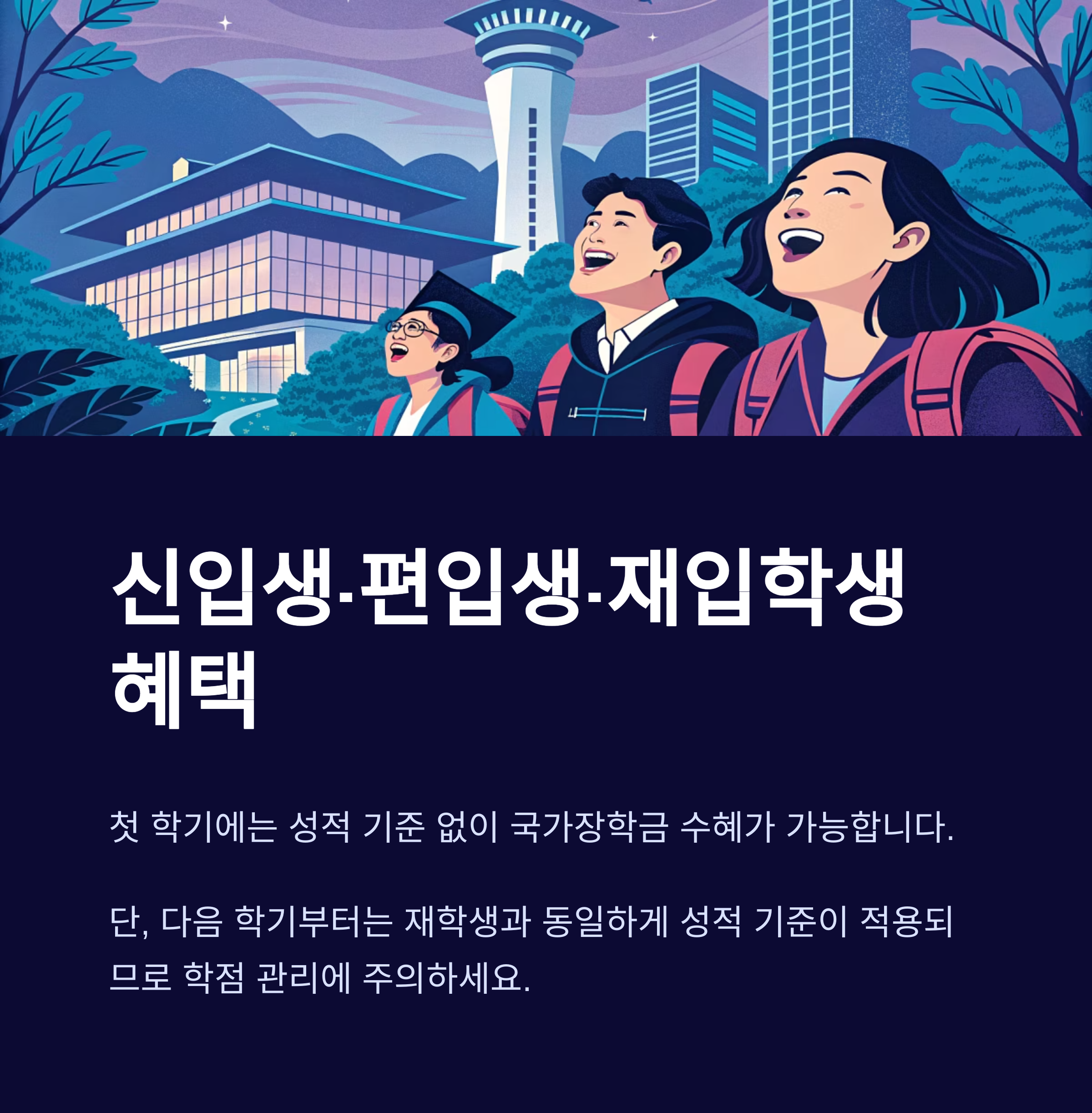 신입생/편입생/재입학생 | 성적 기준 없음(첫 학기 한정) | 다음 학기부터 재학생 기준 적용 |