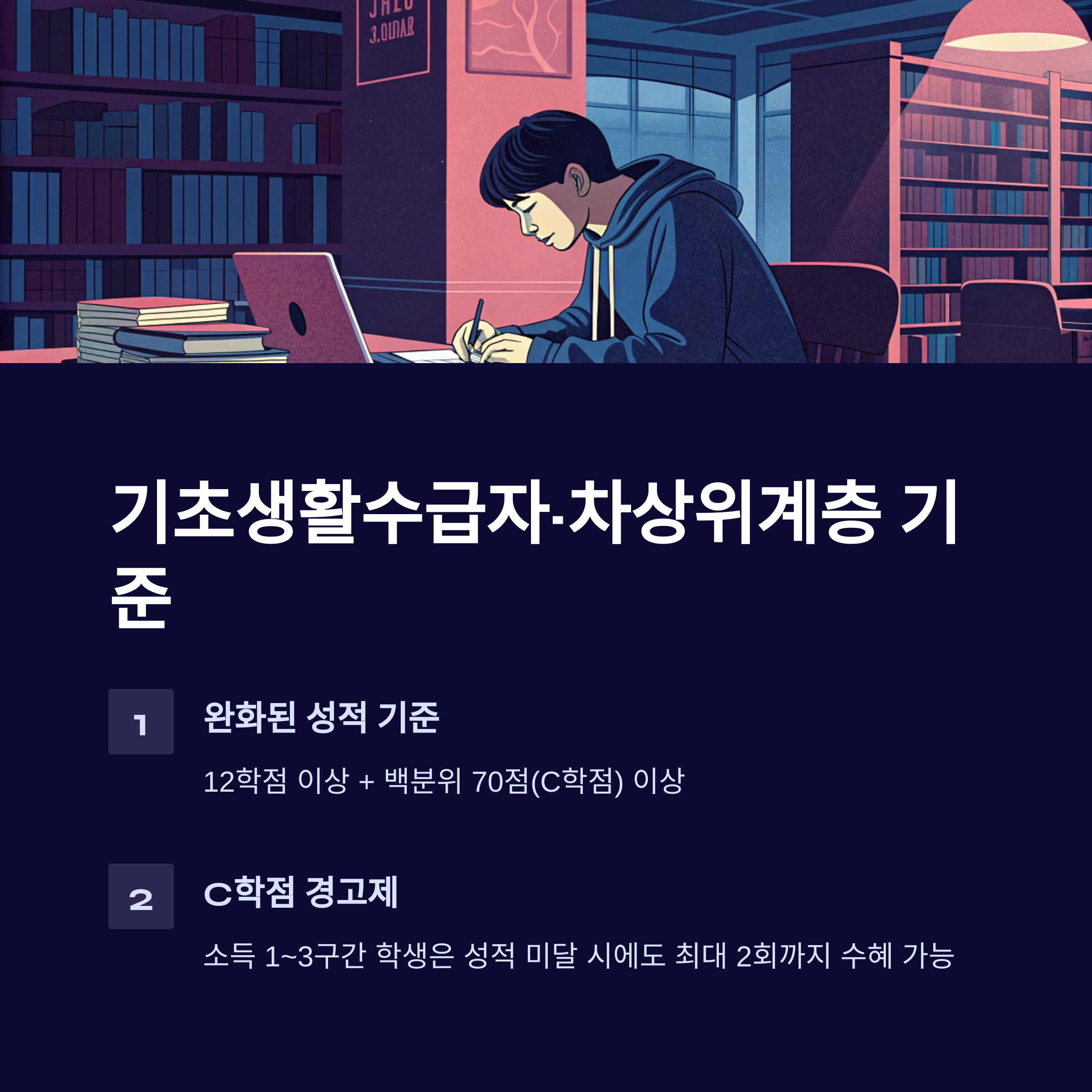 | 기초/차상위계층 | 12학점 이상 + 백분위 70점 이상 | C학점 경고제(최대 2회) 적용 가능 |