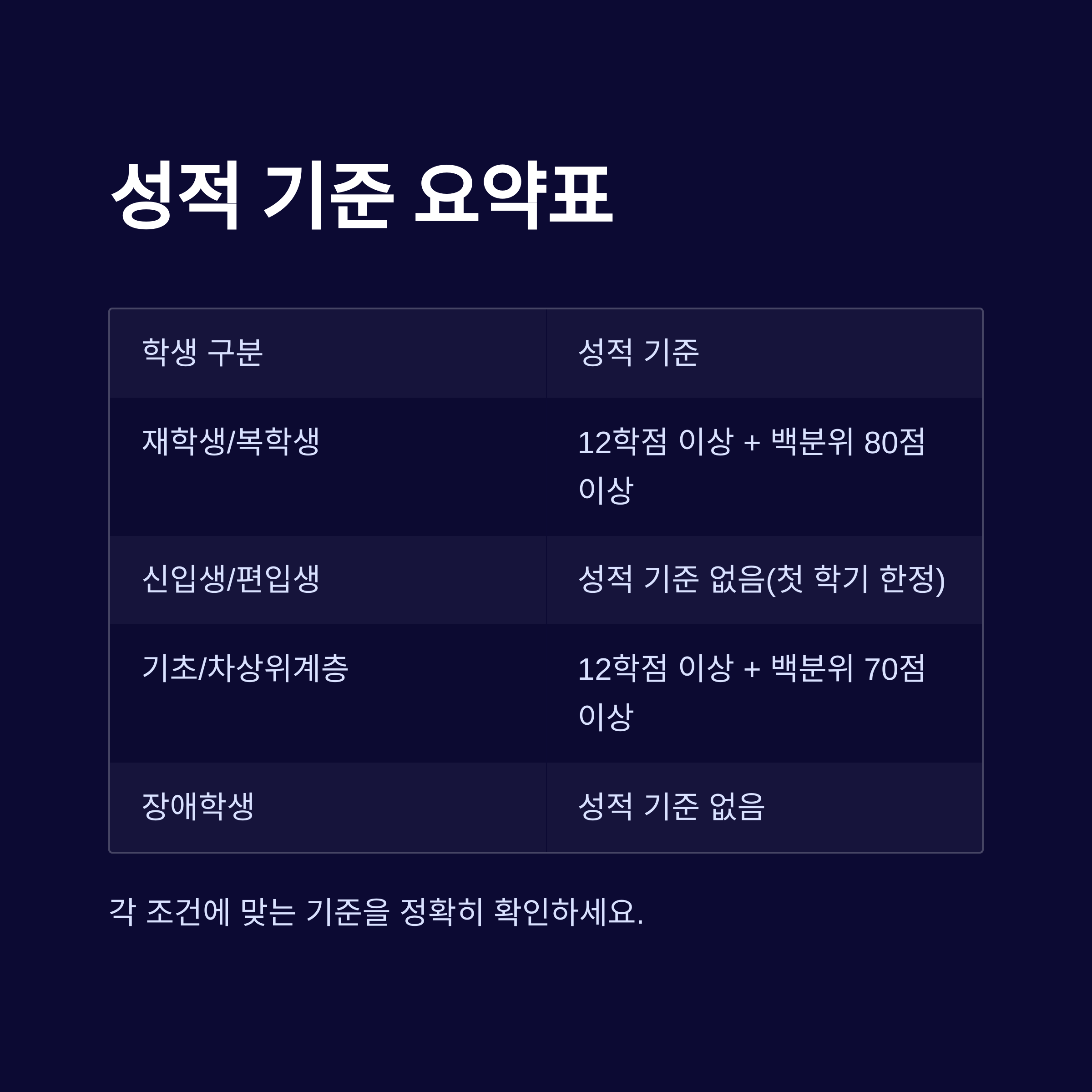 기초/차상위계층 | 12학점 이상 + 백분위 70점 이상 | C학점 경고제(최대 2회) 적용 가능 |