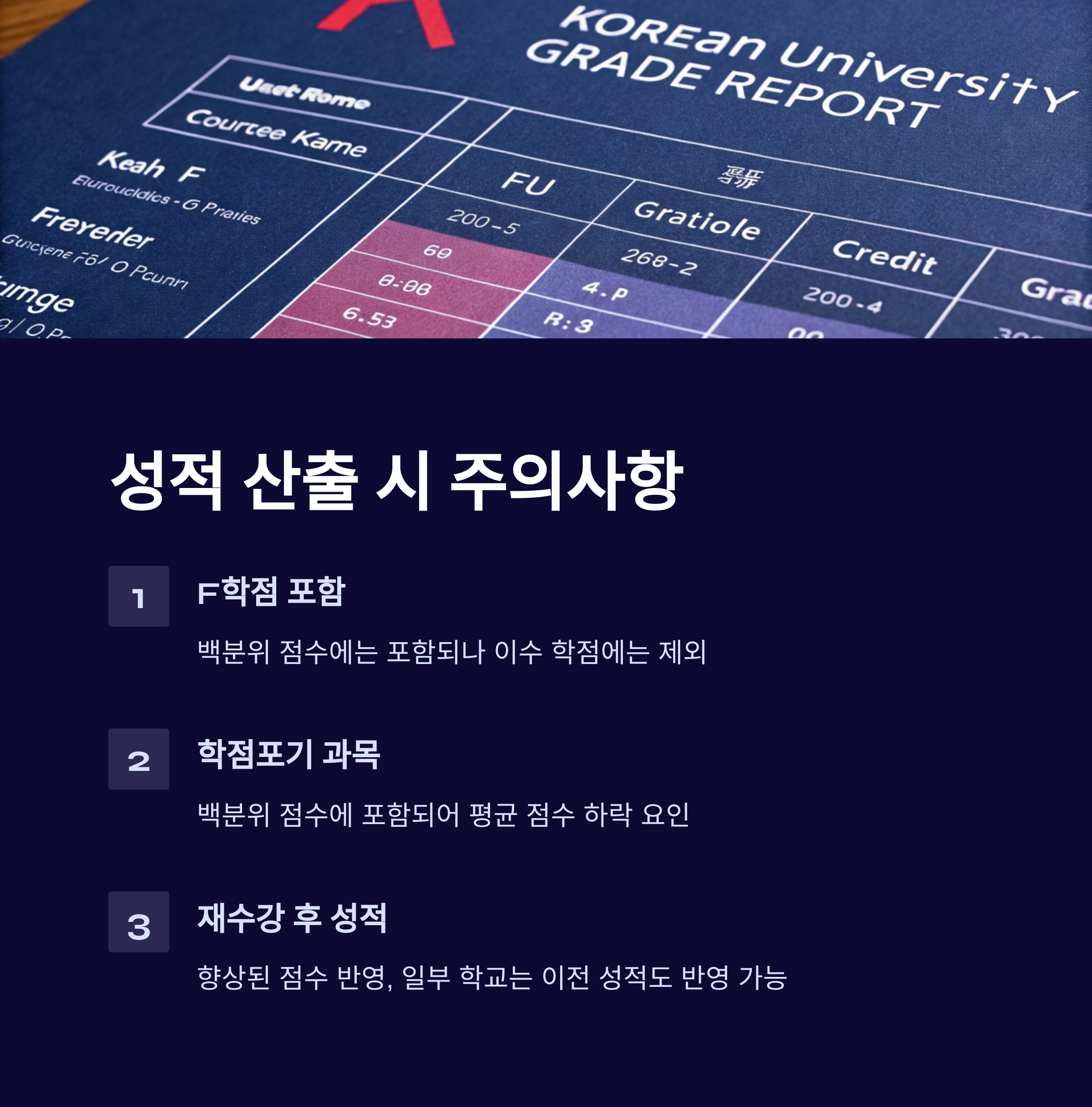 이때 성적 산출은 F학점과 학점포기 과목까지 포함해서 계산되며, 단순히 이수 학점 기준이 아닌 점수 기준이라는 점을 주의해야 합니다.
