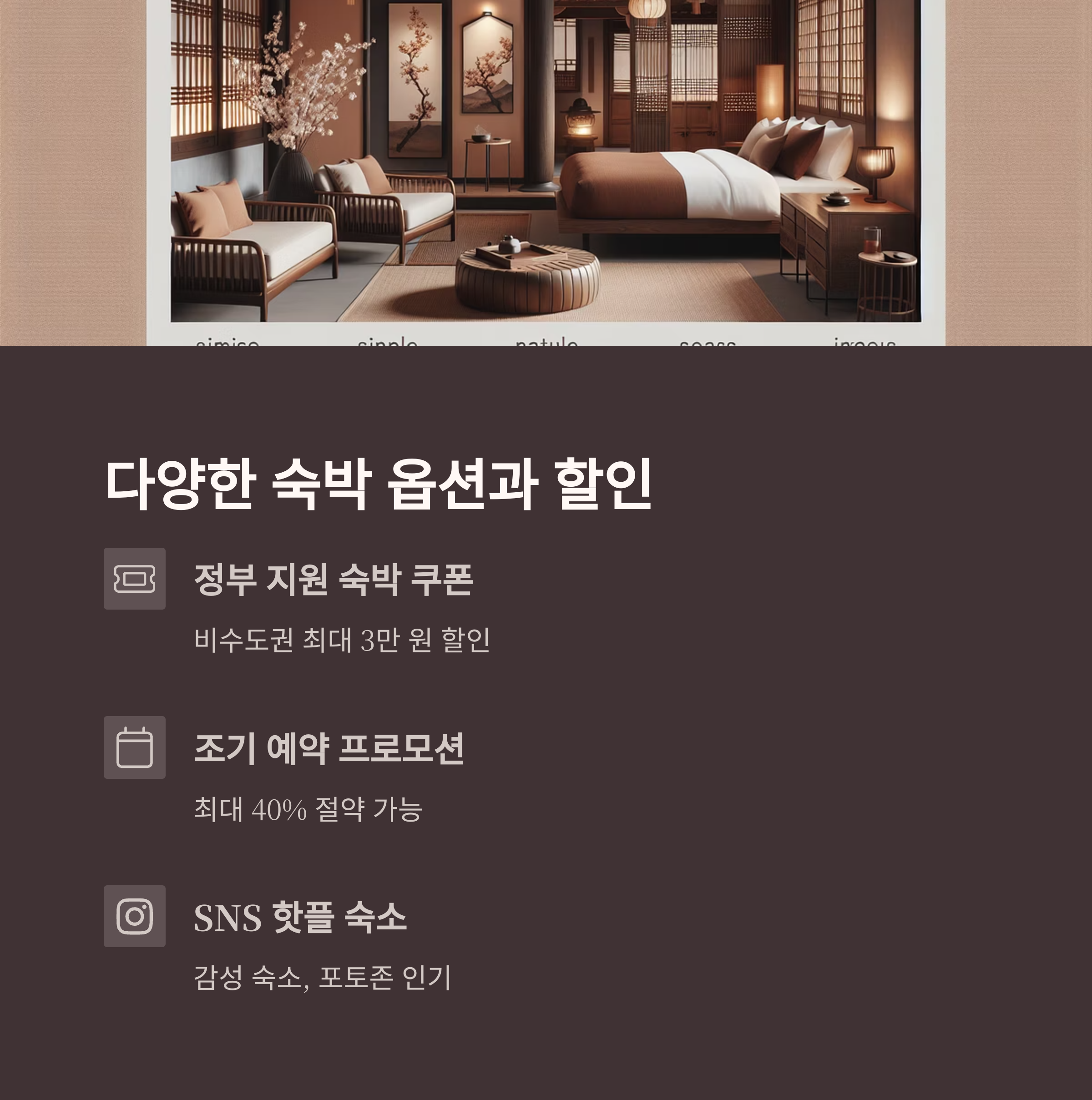 - 숙박 할인: 정부 지원 숙박 쿠폰, 조기 예약 프로모션