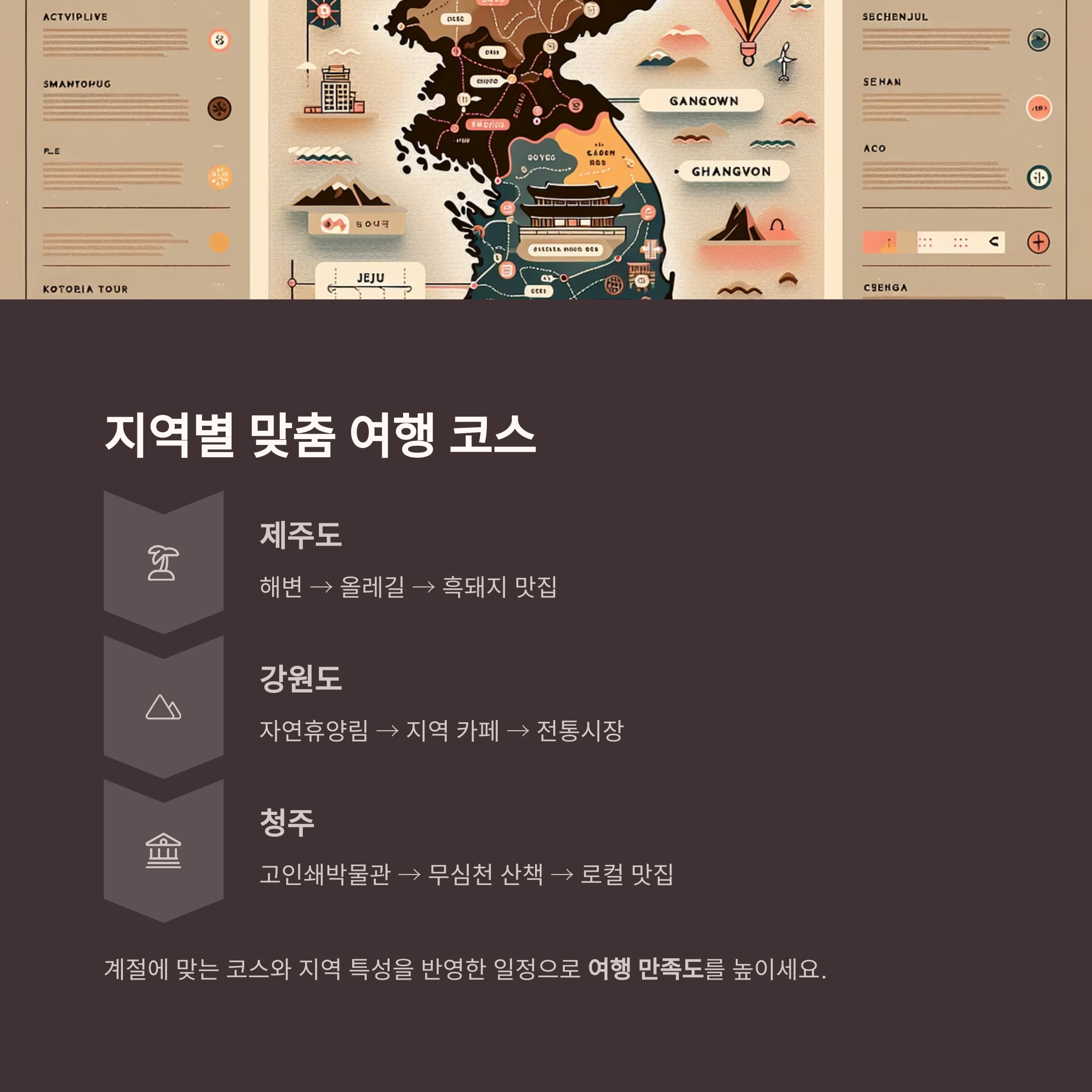 - 강원도: 자연휴양림 → 지역 카페 → 전통시장
