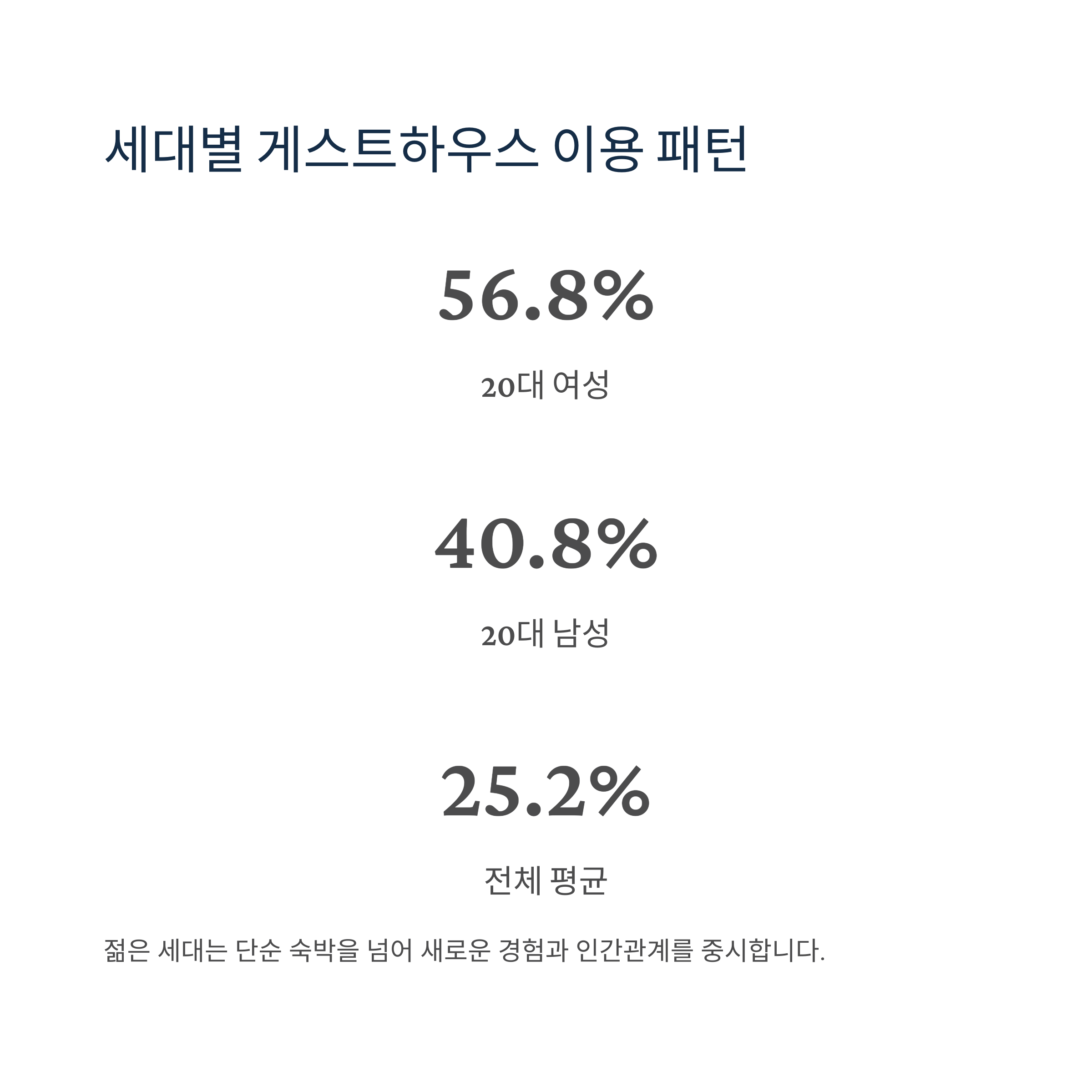 68%의 20대 응답자가 **"게스트하우스는 또래 여행자들과 자연스럽게 만날 수 있는 곳"**이라고 답했습니다.