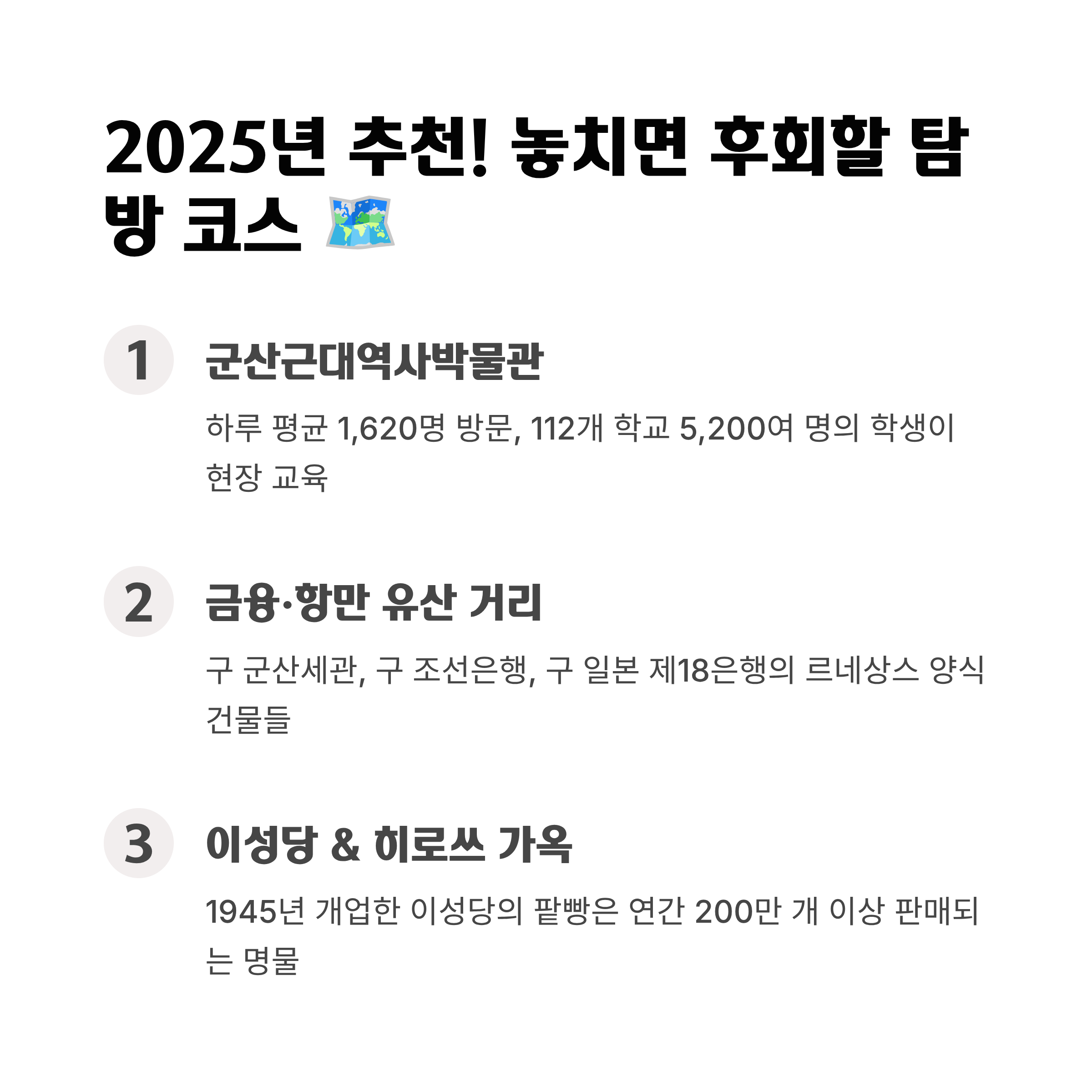결론적으로, 군산 근대문화거리는 전통과 현대, 역사의 아픔과 예술의 감동, 남녀노소 모두를 아우르는 국내 여행의 베스트셀러 공간이라고 할 수 있습니다. 2025년 지금, 전국적으로 가장 이색적이고 감성적인 시간여행을 원한다면 군산 근대문화거리가 최적의 선택임을 최신 데이터가 증명하고 있습니다. 새로운 여정을 원한다면, 군산에서 시간의 흔적과 미래의 영감을 나란히 걸어보세요! 😊