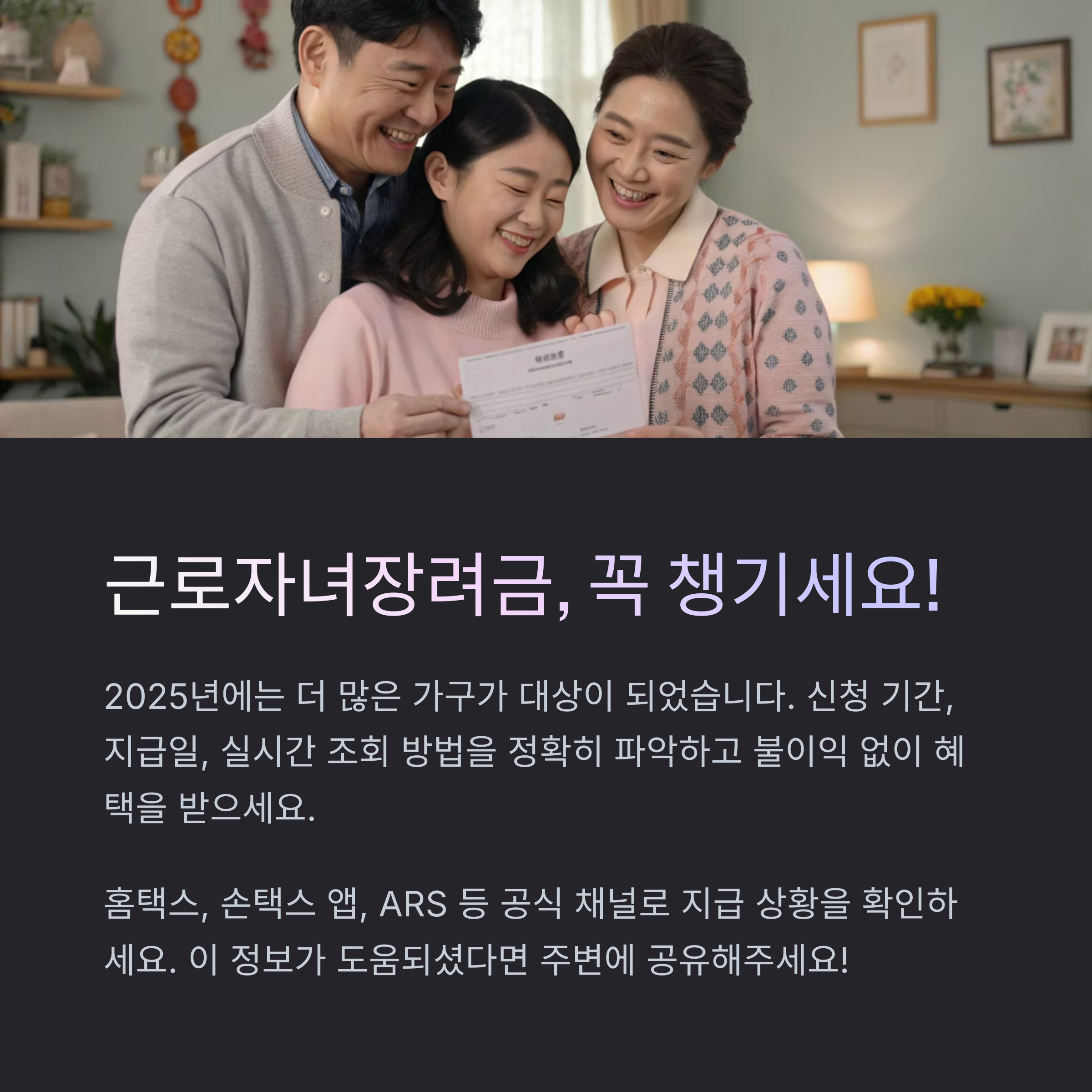2025년 근로자녀장려금 지급은 심사 일정과 신청 방식에 따라 변동 가능성이 있습니다. 본 글에서는 지급일의 변동 이유, 실시간 조회 방법, 신청 기간과 대상 가구 현황까지 빠짐없이 정리해드립니다. 국세청 문자 안내 외에도 홈택스, 손택스 앱, ARS 등을 통해 지급 여부를 직접 확인할 수 있으니 꼭 챙겨보세요.