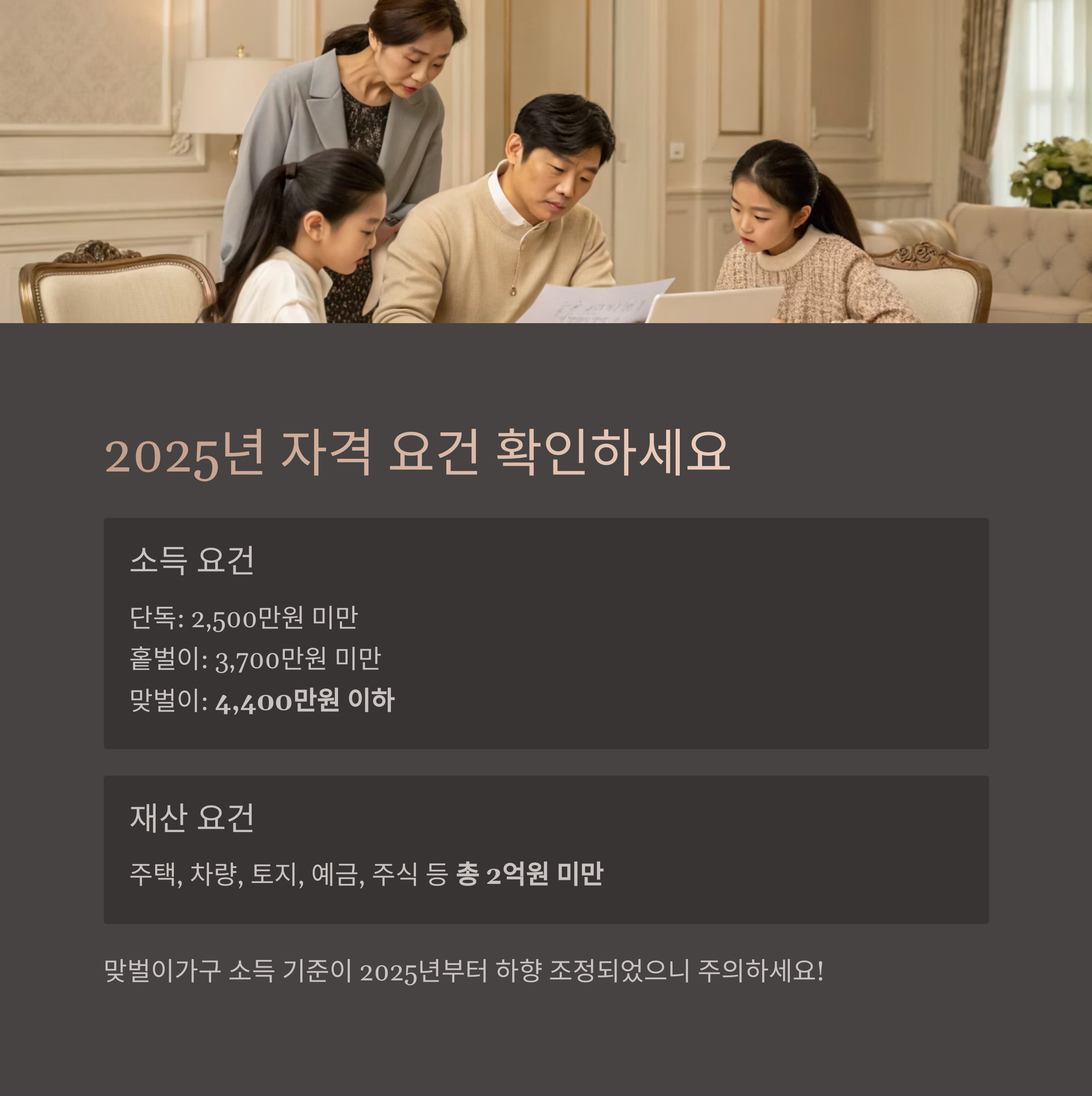 특히 2025년부터 맞벌이가구 소득 기준이 변경되었으므로 주의하세요.