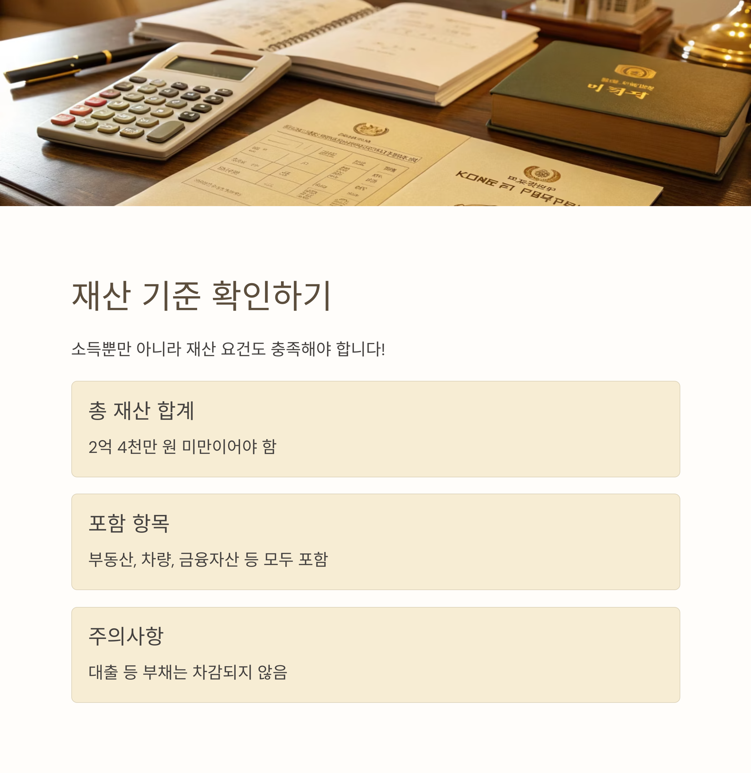 "재산 기준을 넘으면 소득이 아무리 낮아도 탈락할 수 있어요. 꼼꼼히 확인해보세요!"