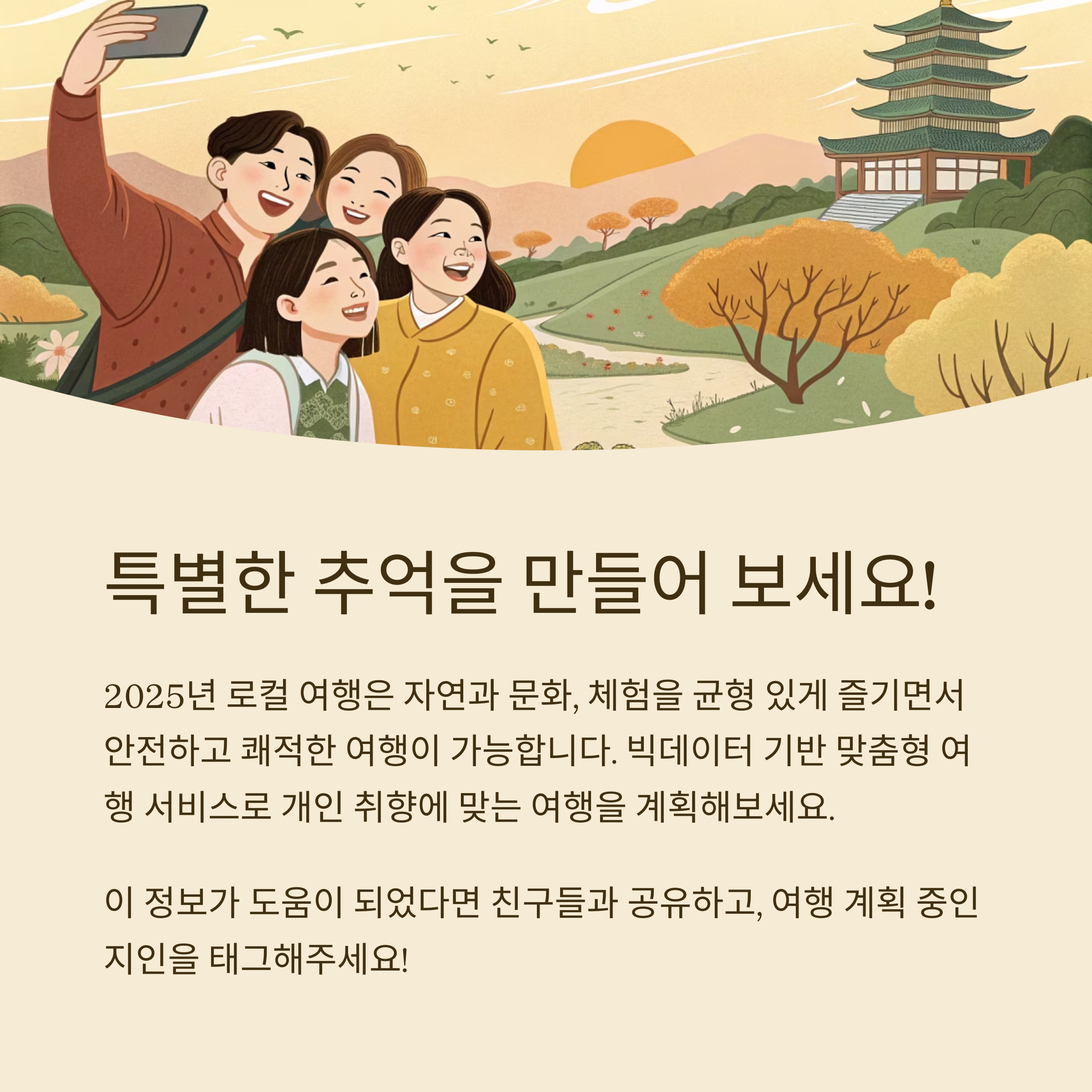 2025년 로컬 여행은 자연과 문화, 체험을 균형 있게 즐기면서도 안전하고 쾌적한 여행이 가능합니다.