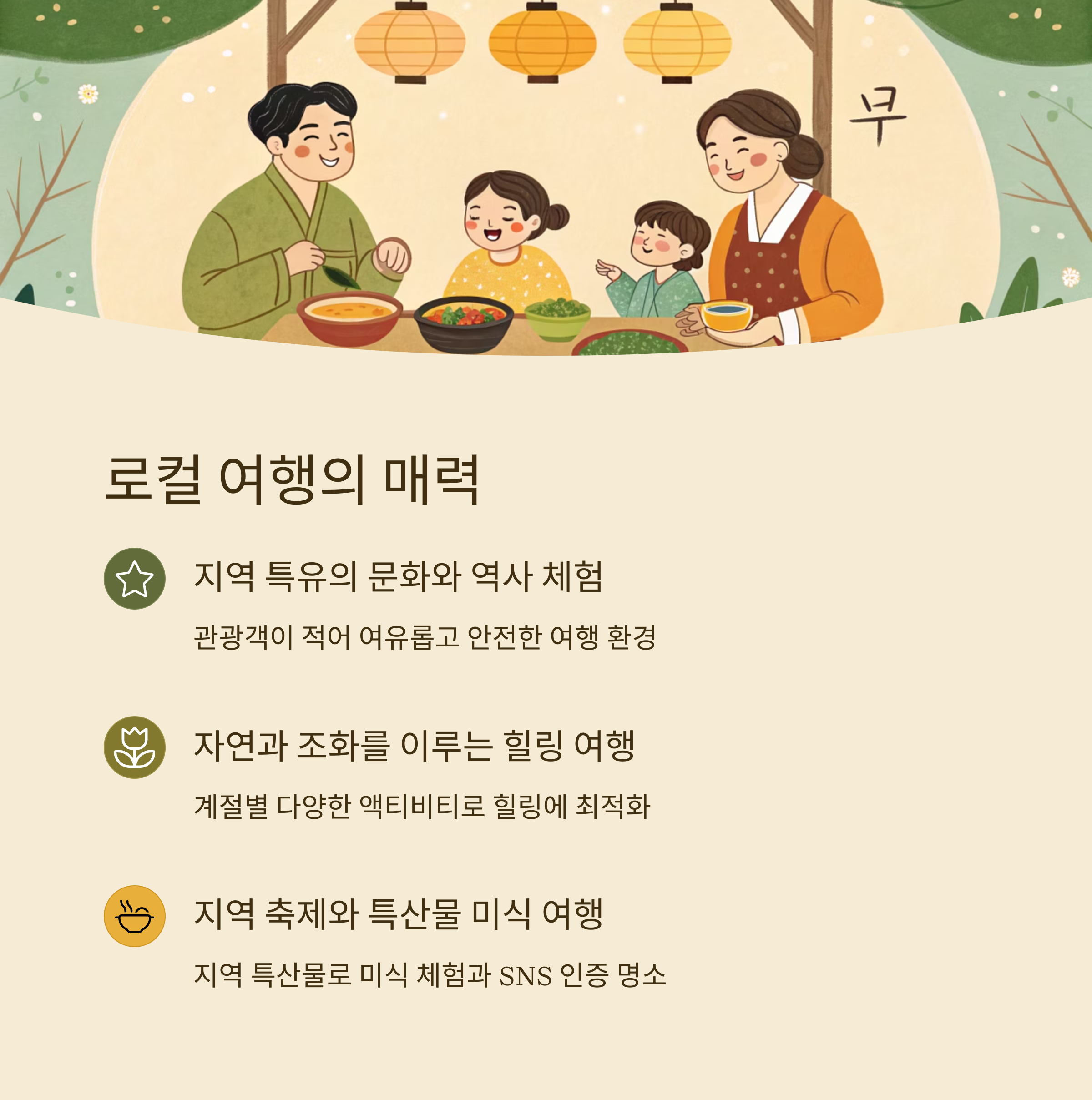 국내 여행객들도 자연과 문화, 체험 중심의 로컬 여행을 선호하며, 지역 경제 활성화에도 기여하고 있습니다.