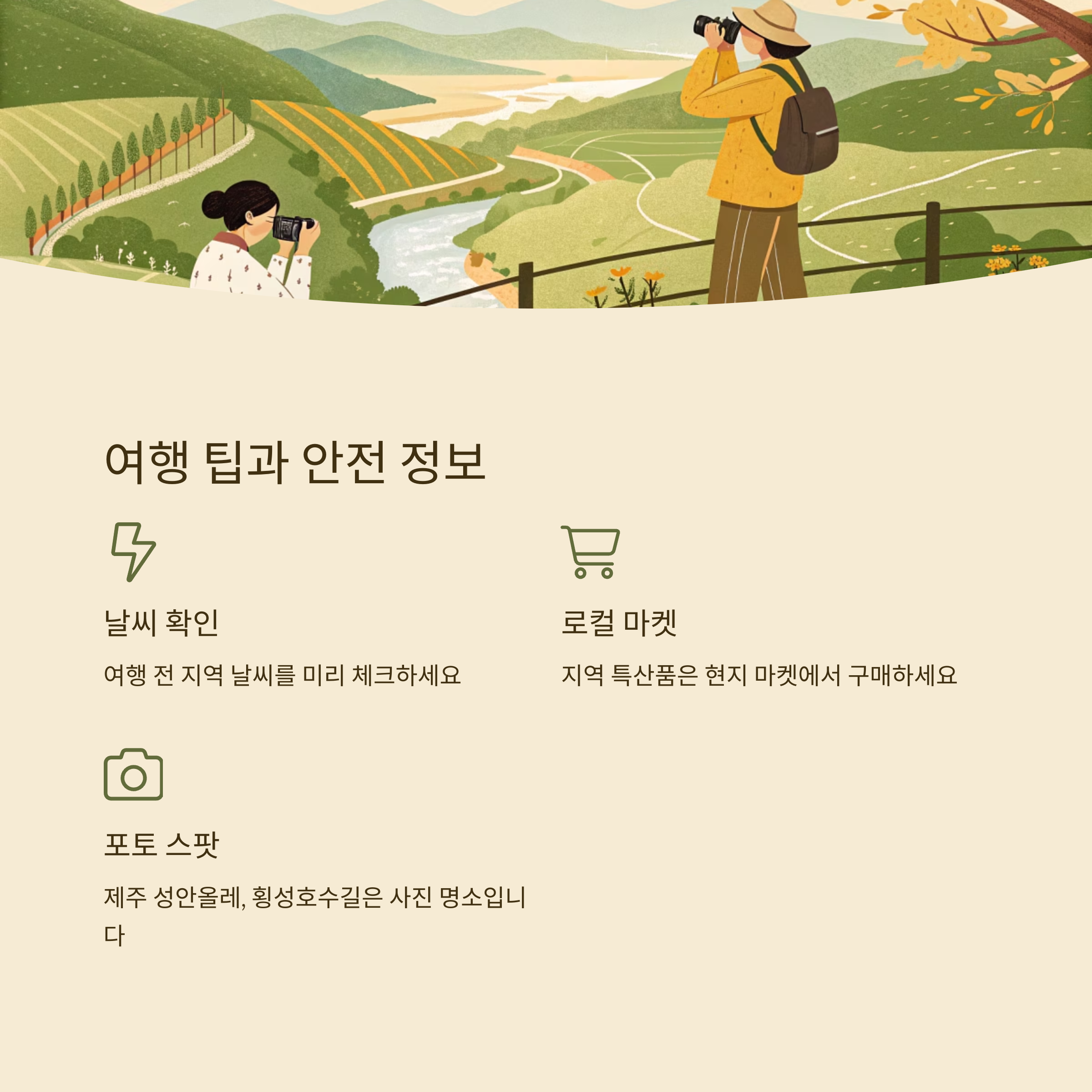 - 예를 들어, 제주 성안올레와 강원도 횡성호수길은 포토 스팟으로 유명합니다.