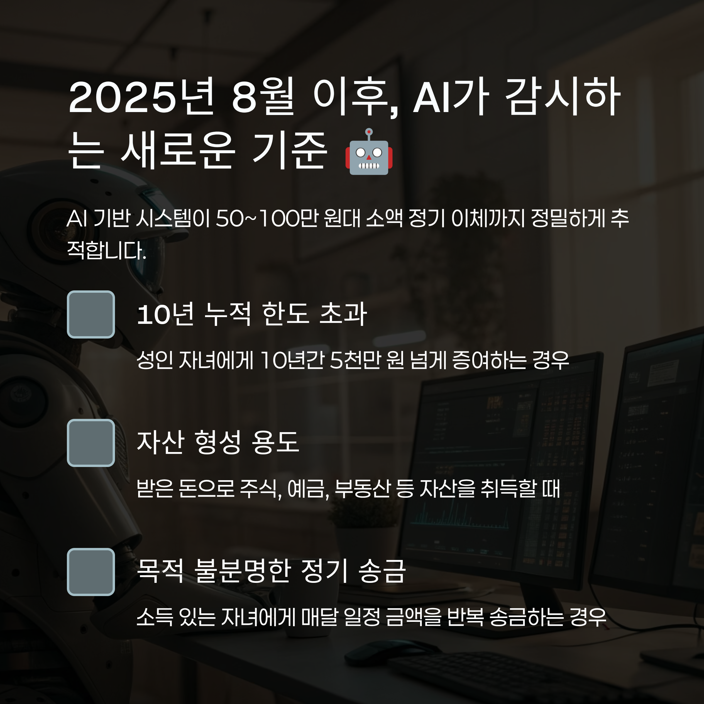예전에는 수천만 원 단위의 큰 금액만 국세청의 감시 대상이었어요. 그런데 2025년 8월부터는 상황이 완전히 바뀝니다. 바로 AI 기반 시스템이 50만 원에서 100만 원대 소액 정기 이체까지 정밀하게 추적하기 때문인데요. 매달 꼬박꼬박 비슷한 금액을 송금하면, AI는 그 이체에 '정기성'과 '자금 축적' 정황이 있다고 판단하고 바로 모니터링 대상에 올리게 됩니다. 이체 사실 자체만으로도 증여세 리스크가 확 커진 거죠.