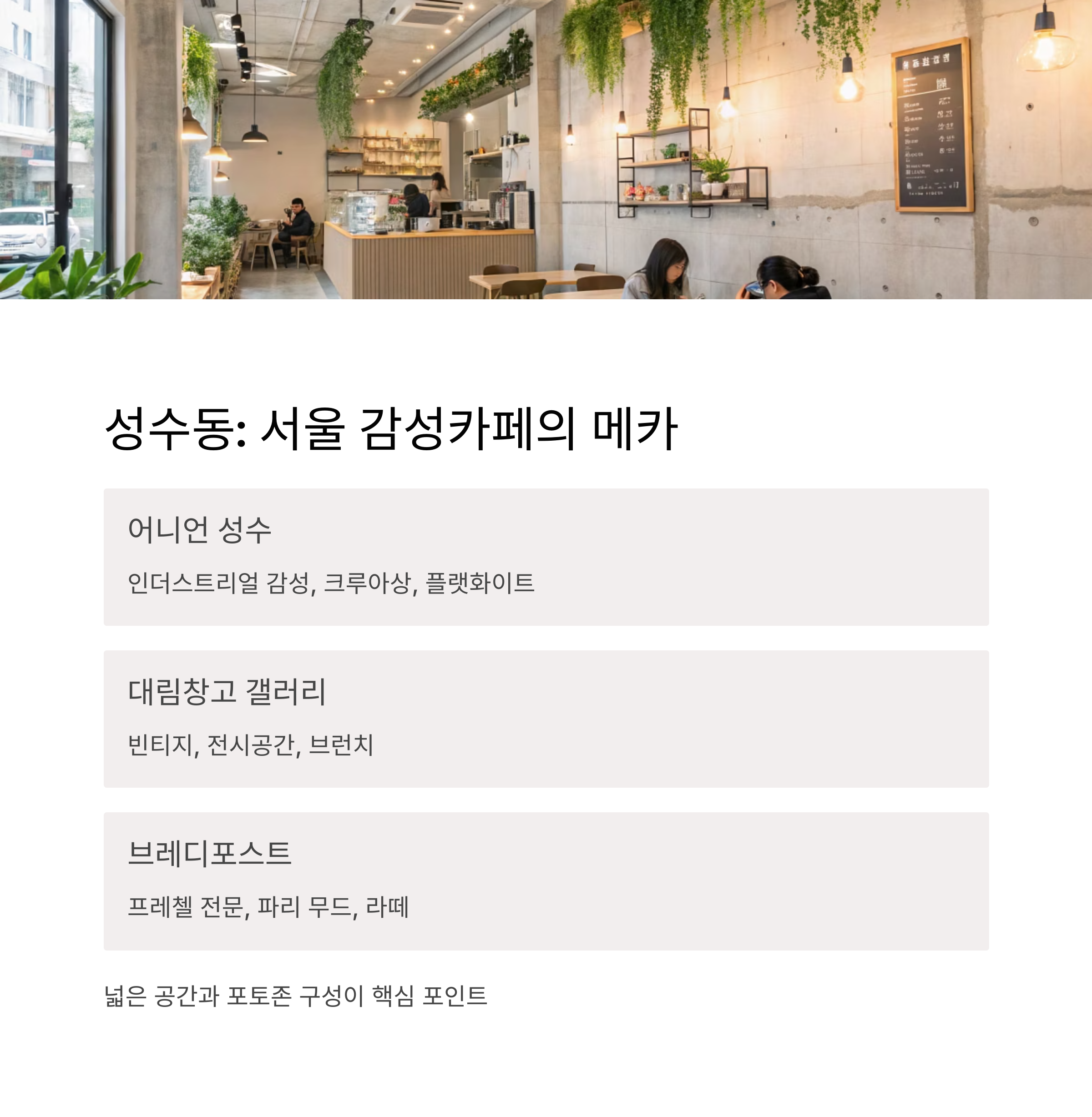 성수동은 여전히 서울 감성카페 트렌드의 중심입니다.