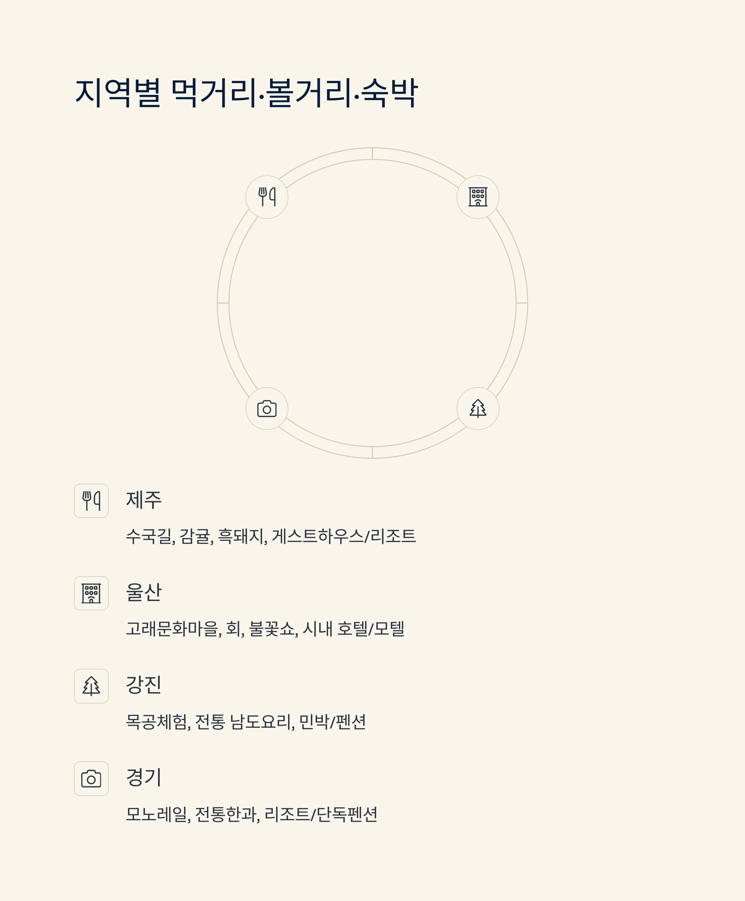 | 가족여행 | 울산, 강진, 신안, 공주 | 체험 프로그램 풍성, 접근성 좋음 |