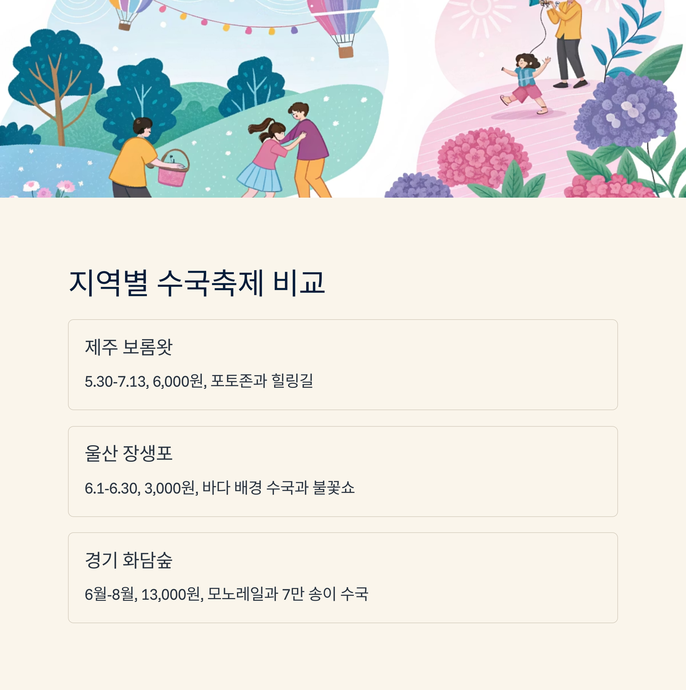 이 글에서는 지역별 수국축제 비교, 추천 일정, 교통편,