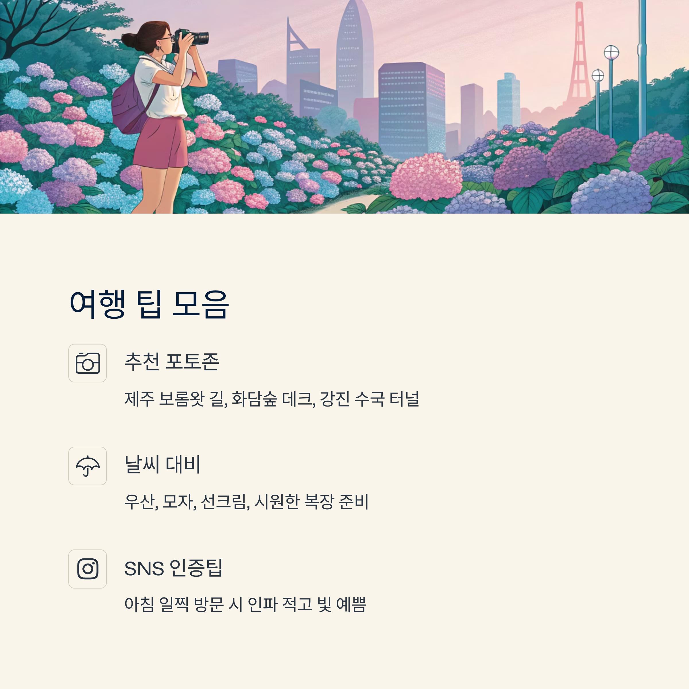 - 추천 포토존: 제주 보롬왓 길, 화담숲 데크, 강진 수국 터널, 공주 야간조명