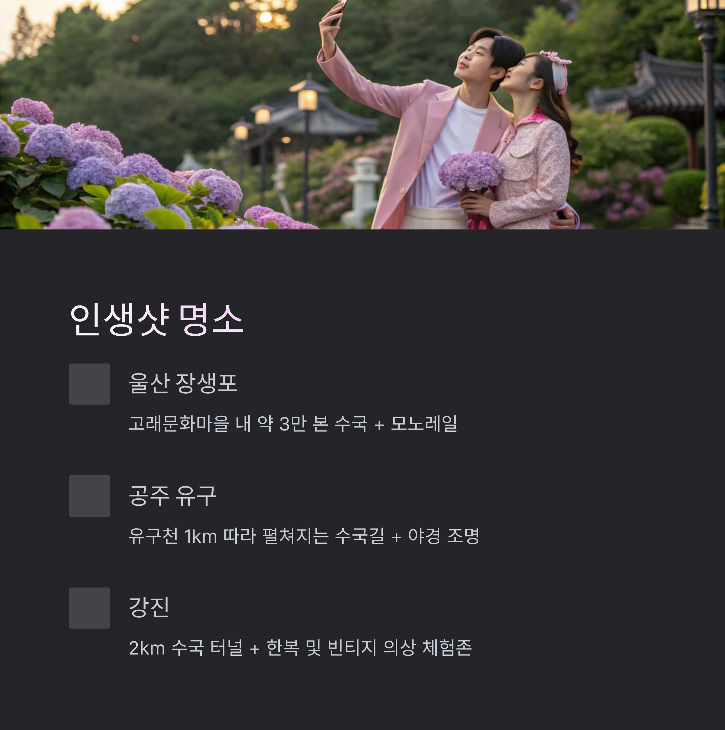 - 강진: 2km 수국 터널 + 한복 및 빈티지 의상 체험존