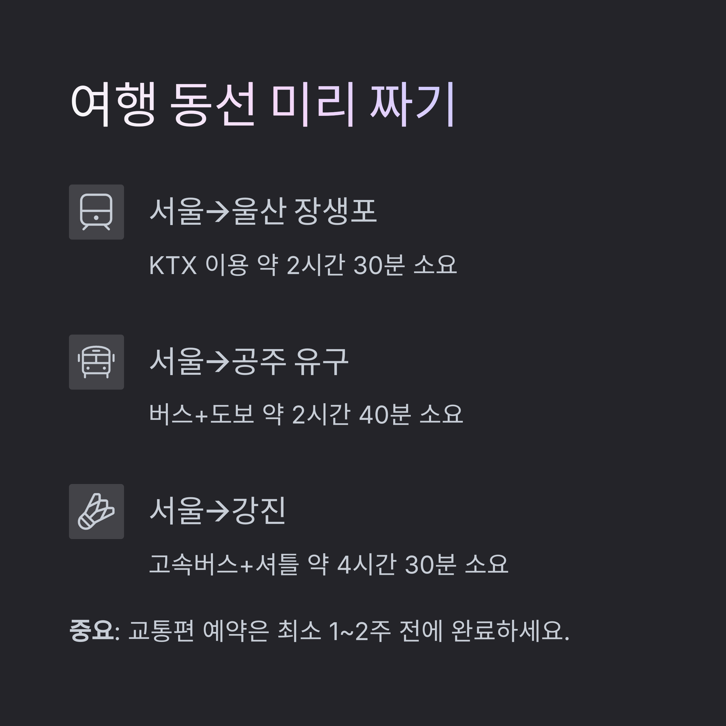 중요: 교통편 예약은 최소 1~2주 전에 완료하는 것이 좋습니다.