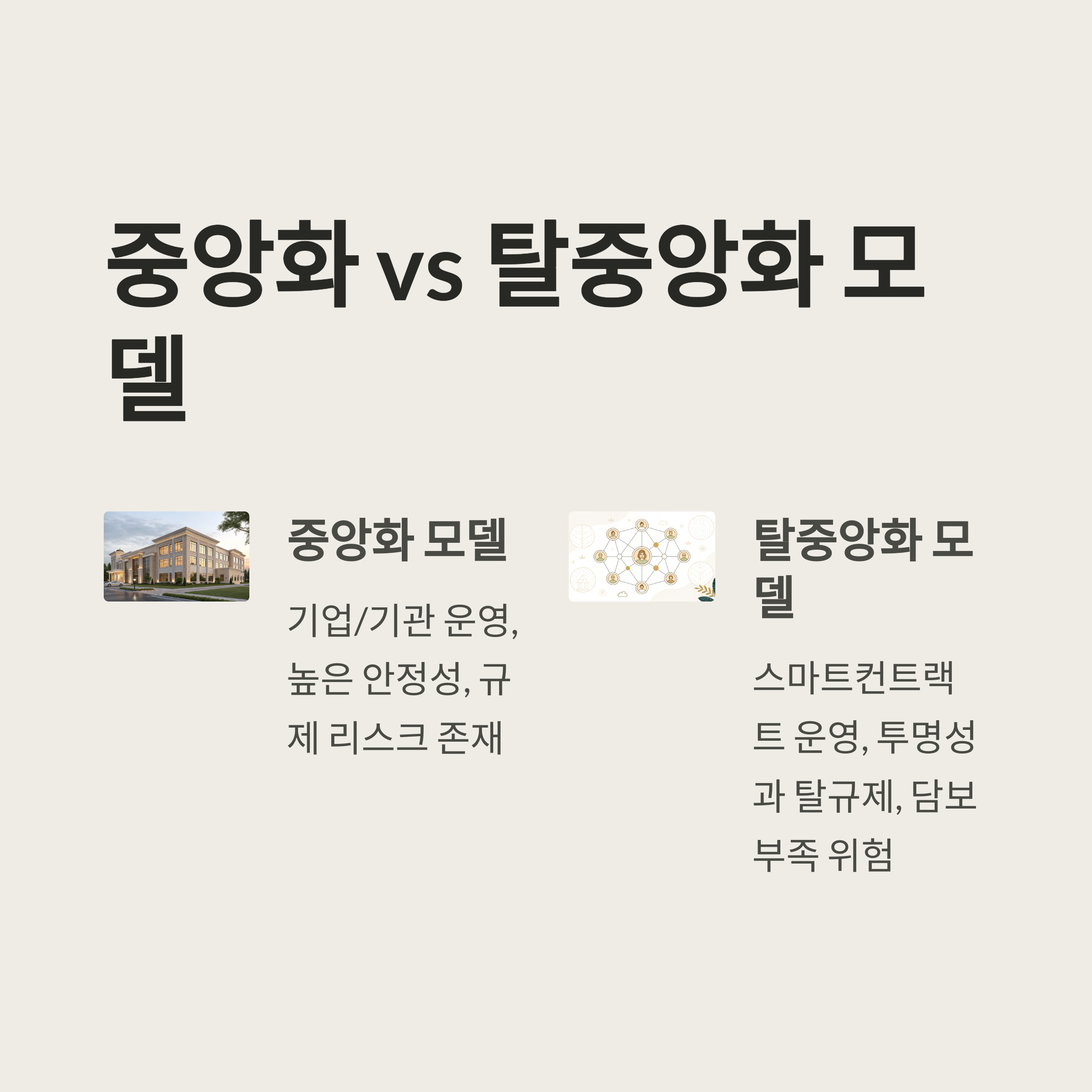 | 중앙화 | 기업/기관 | 높은 안정성 | 규제 리스크 |