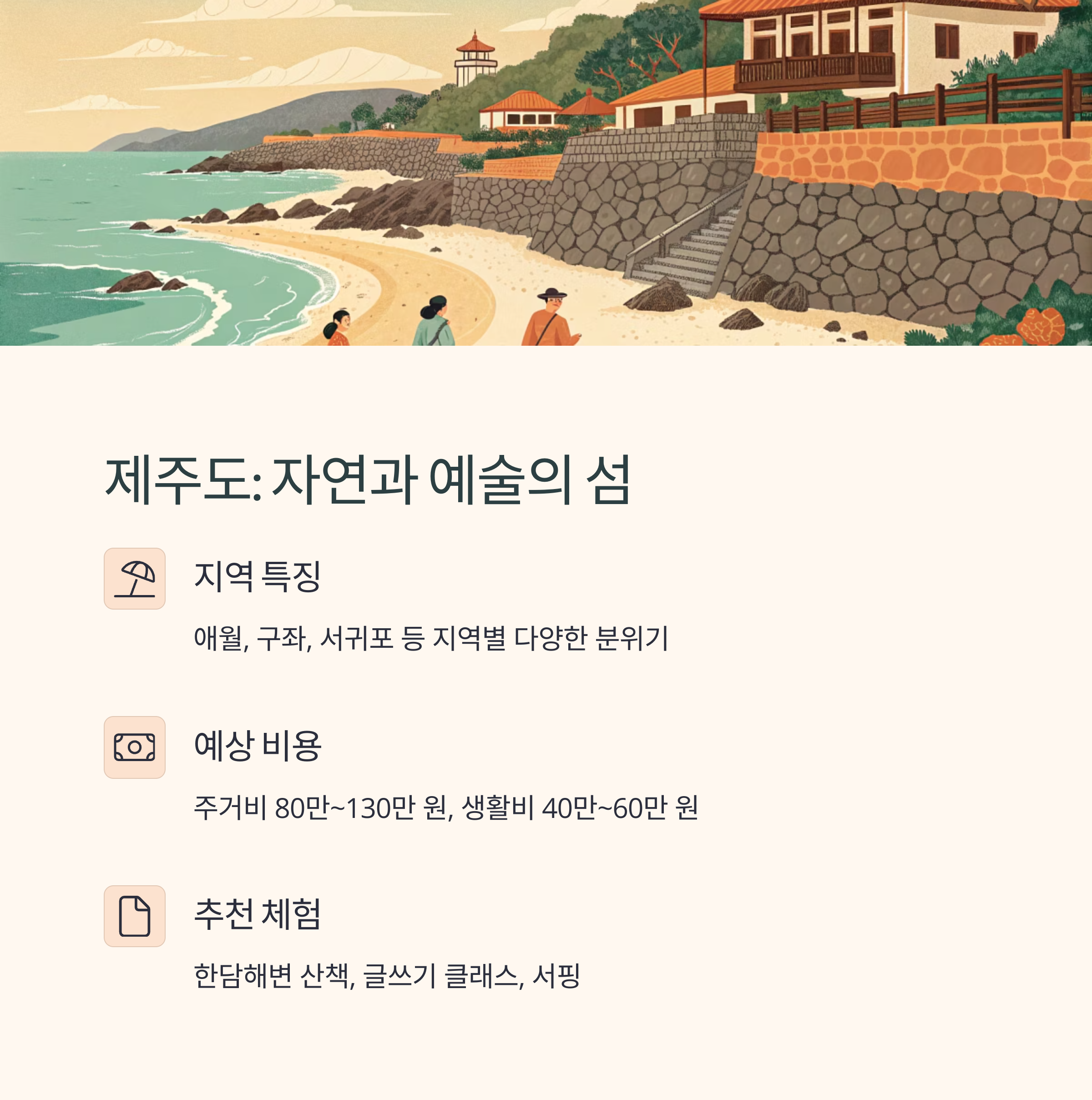 제주도는 자연과 예술이 공존하는 섬으로, 한 달 살기 최적의 장소입니다. 애월, 구좌, 서귀포 등 지역별로 분위기가 다르며, 자연, 바다, 돌담, 한적한 길, 다양한 작가·프리랜서 커뮤니티가 특징입니다. 월 주거비는 80만130만 원, 생활비는 40만60만 원으로 예상됩니다. 추천 체험으로는 한담해변 산책, 제주 글쓰기 클래스, 로컬시장 탐방, 서핑 등이 있습니다.