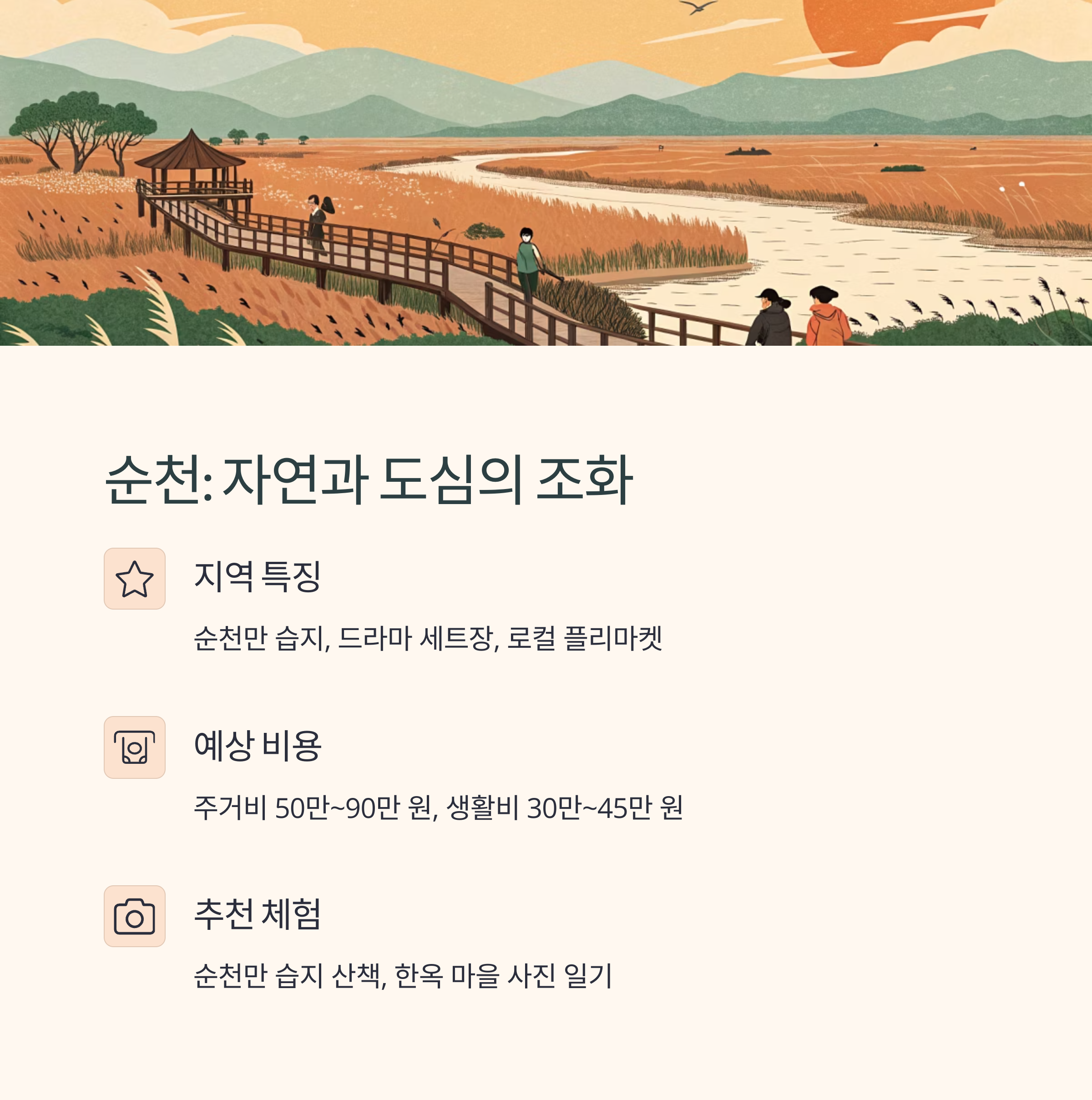 순천은 자연과 도심이 공존하는 도시로, 슬로시티 분위기를 느낄 수 있습니다. 순천만, 동천 강변길 등에서 다양한 체험이 가능하며, 자연과 도심 공존, 순천만 습지, 드라마 세트장, 로컬 플리마켓이 특징입니다. 월 주거비는 50만90만 원, 생활비는 30만45만 원으로 예상됩니다. 추천 체험으로는 순천만 습지 산책, 로컬 플리마켓 참가, 한옥 마을 사진 일기 등이 있습니다.