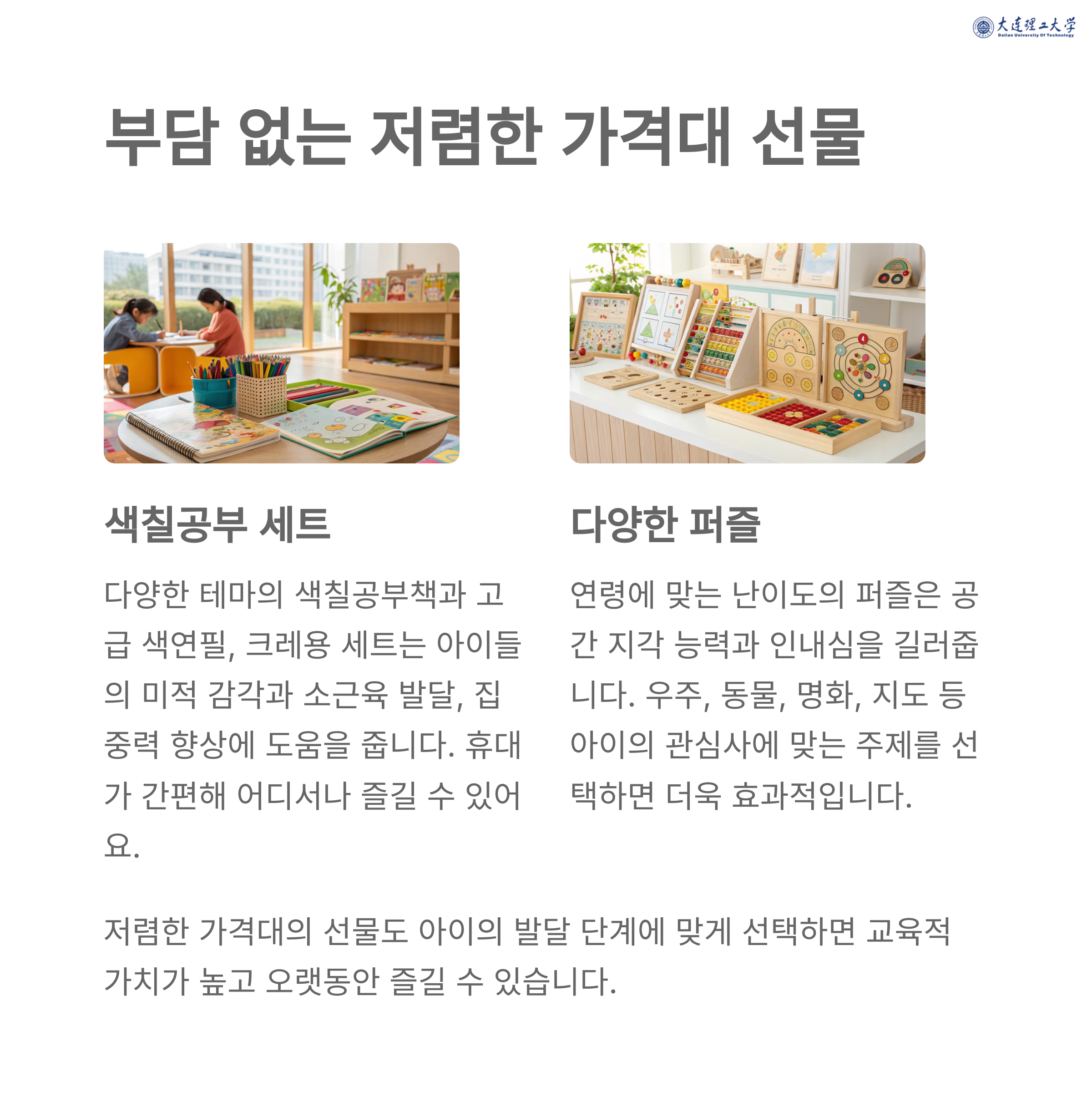 퍼즐: 나이에 맞는 어려움으로 구성된 퍼즐은 문제 해결 능력을 기르는 데 효과적입니다.