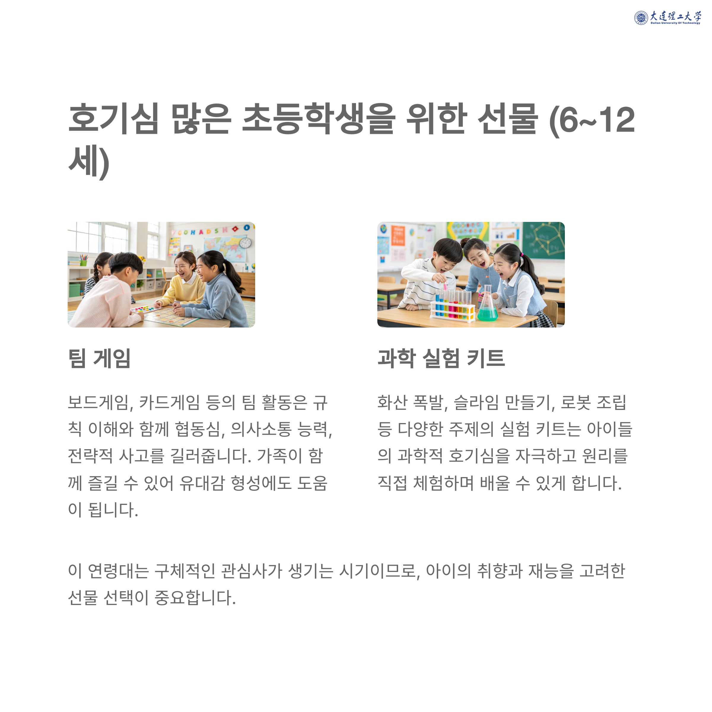 과학 및 미술 키트: DIY 키트나 과학 실험 키트는 창의력과 과학적 사고를 키우는 데 유용합니다. 예를 들어, 화학 실험 키트는 안전하게 과학 실험을 체험할 수 있는 기회를 제공합니다. 간단한 화학 반응을 통해 색깔이 변하는 실험을 해보는 것은 아이들에게 과학의 매력을 느끼게 하는 좋은 방법입니다.
