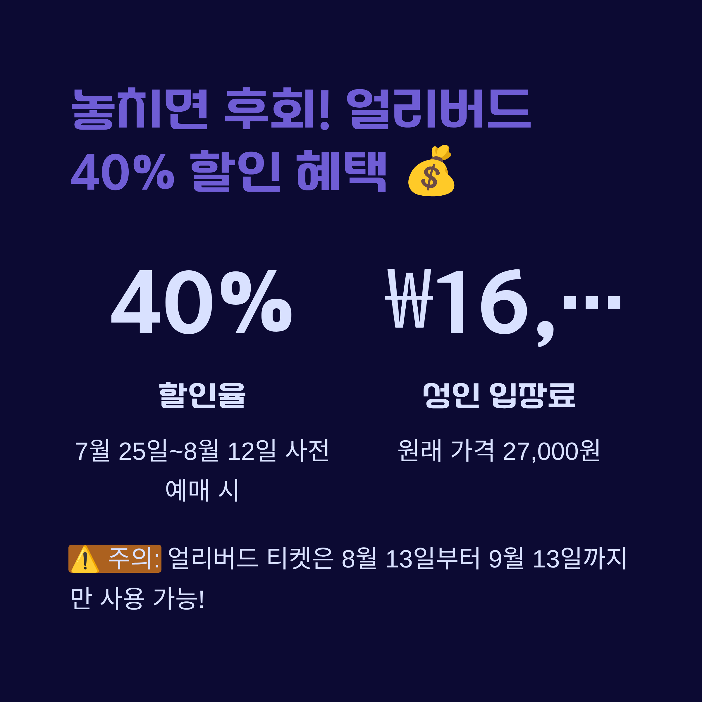 - 파격적 얼리버드 혜택: 7/25~8/12 기간 동안 최대 40% 할인된 가격으로 합리적인 문화 체험이 가능합니다.