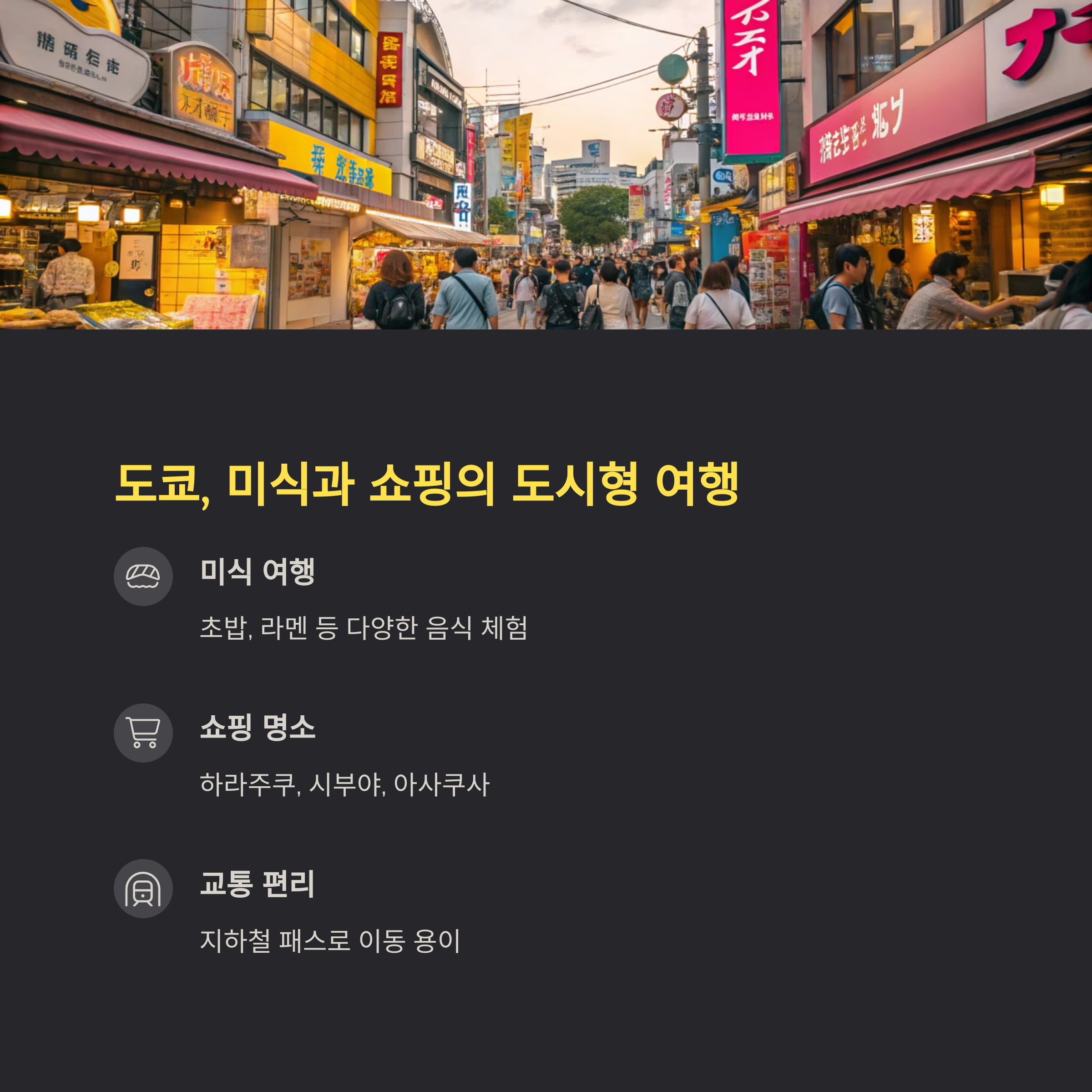 | 도쿄 | 쇼핑+미식+문화 체험 | 70만~120만 원 | 3박 4일 이상 | 가족, 혼행 |
