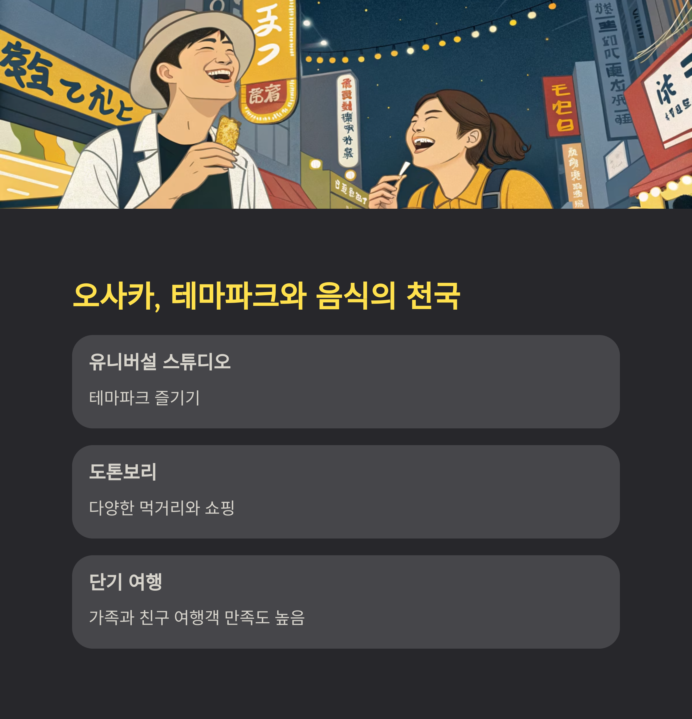| 오사카 | 테마파크+음식+역사 | 70만~110만 원 | 3박 4일 이상 | 가족, 친구 |
