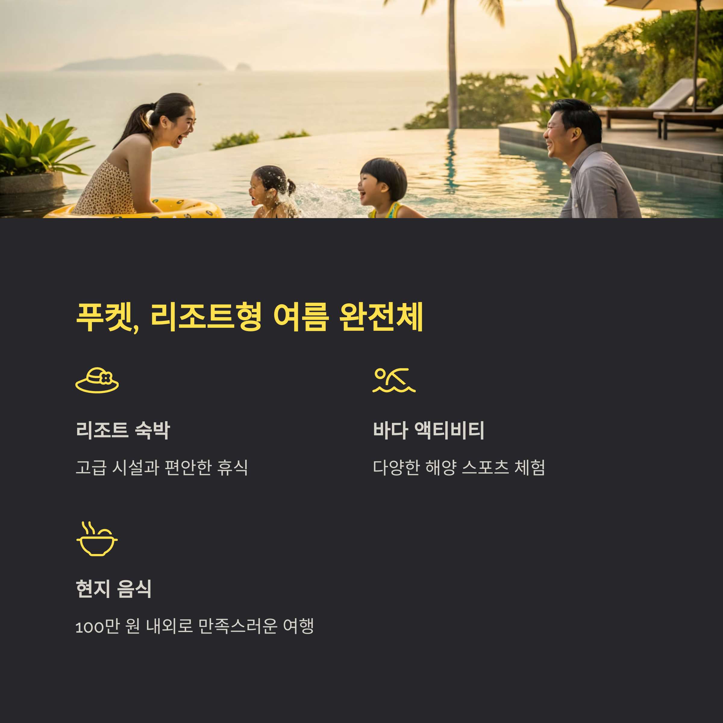 | 푸켓 | 리조트+가족 액티비티 | 90만~130만 원 | 4박 5일 | 가족 |
