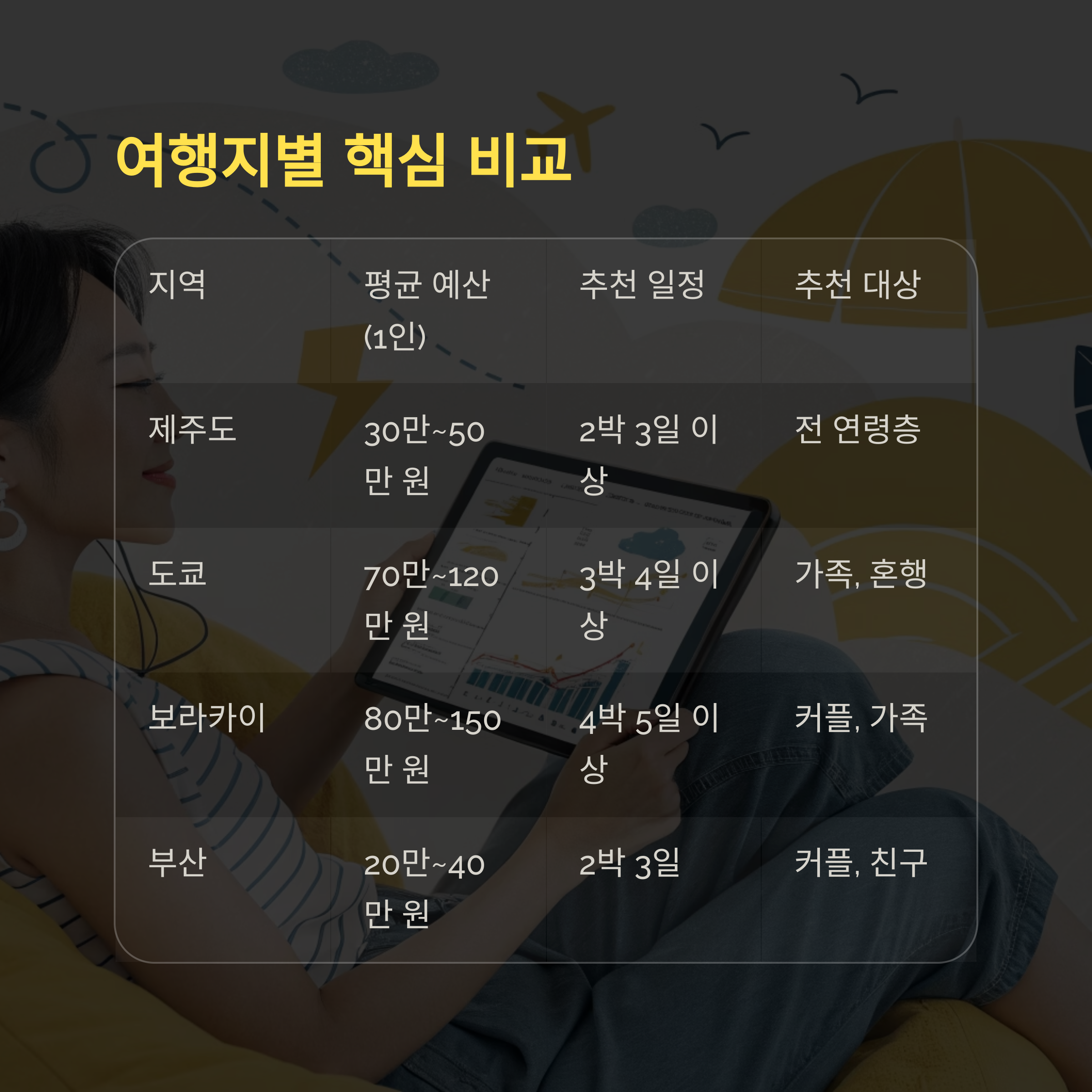 | 제주도 | 자연+먹거리+힐링 조화 | 30만~50만 원 | 2박 3일 이상 | 전 연령층 |