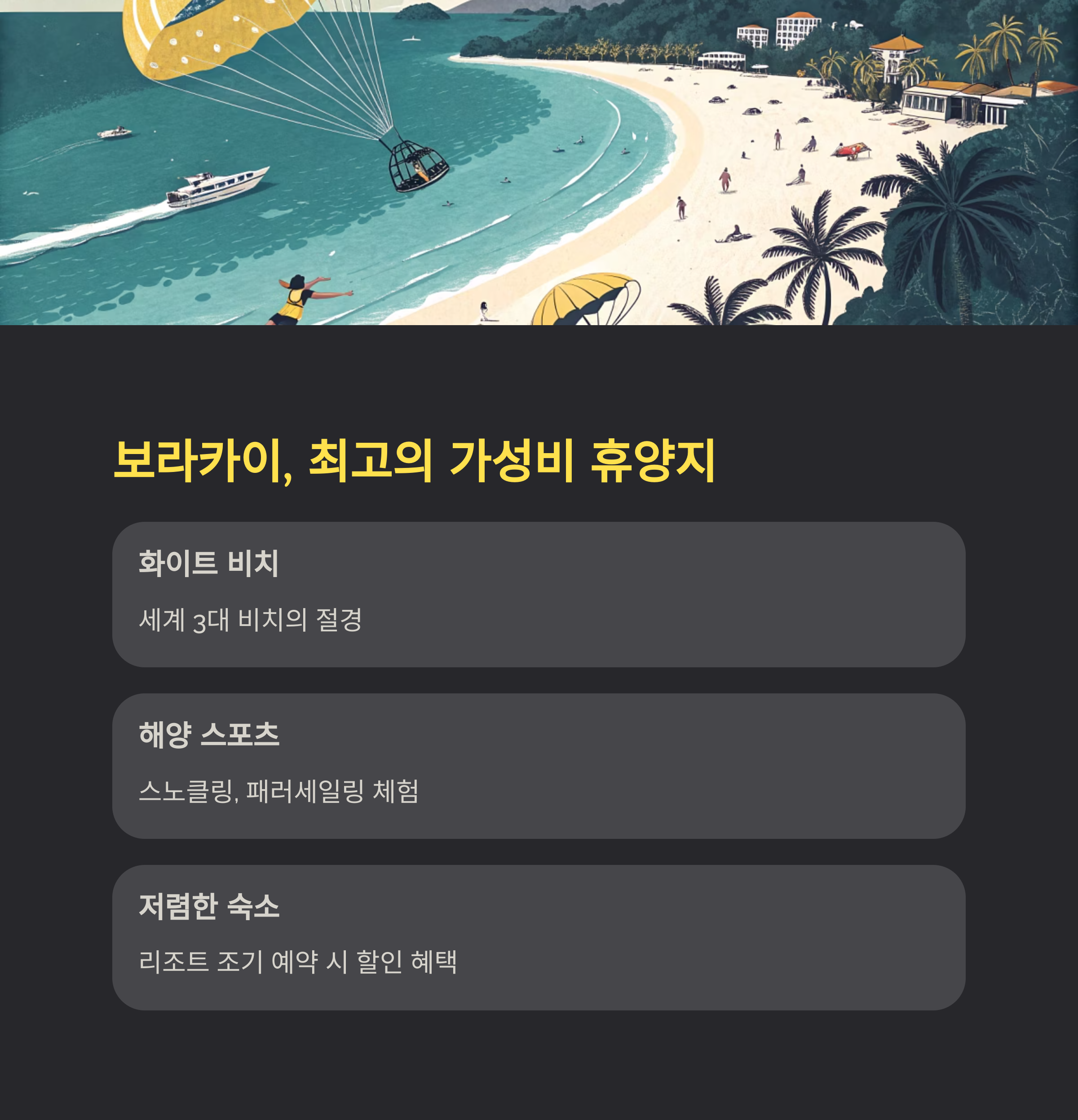 | 보라카이 | 바다+리조트+액티비티 | 80만~150만 원 | 4박 5일 이상 | 커플, 가족 |
