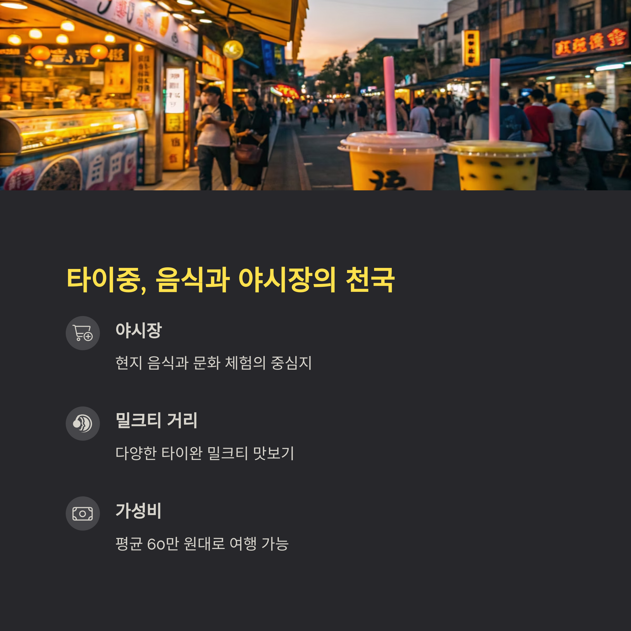 | 타이중 | 야시장+저렴한 여행 | 50만~70만 원 | 3박 4일 | 혼행, 친구 |