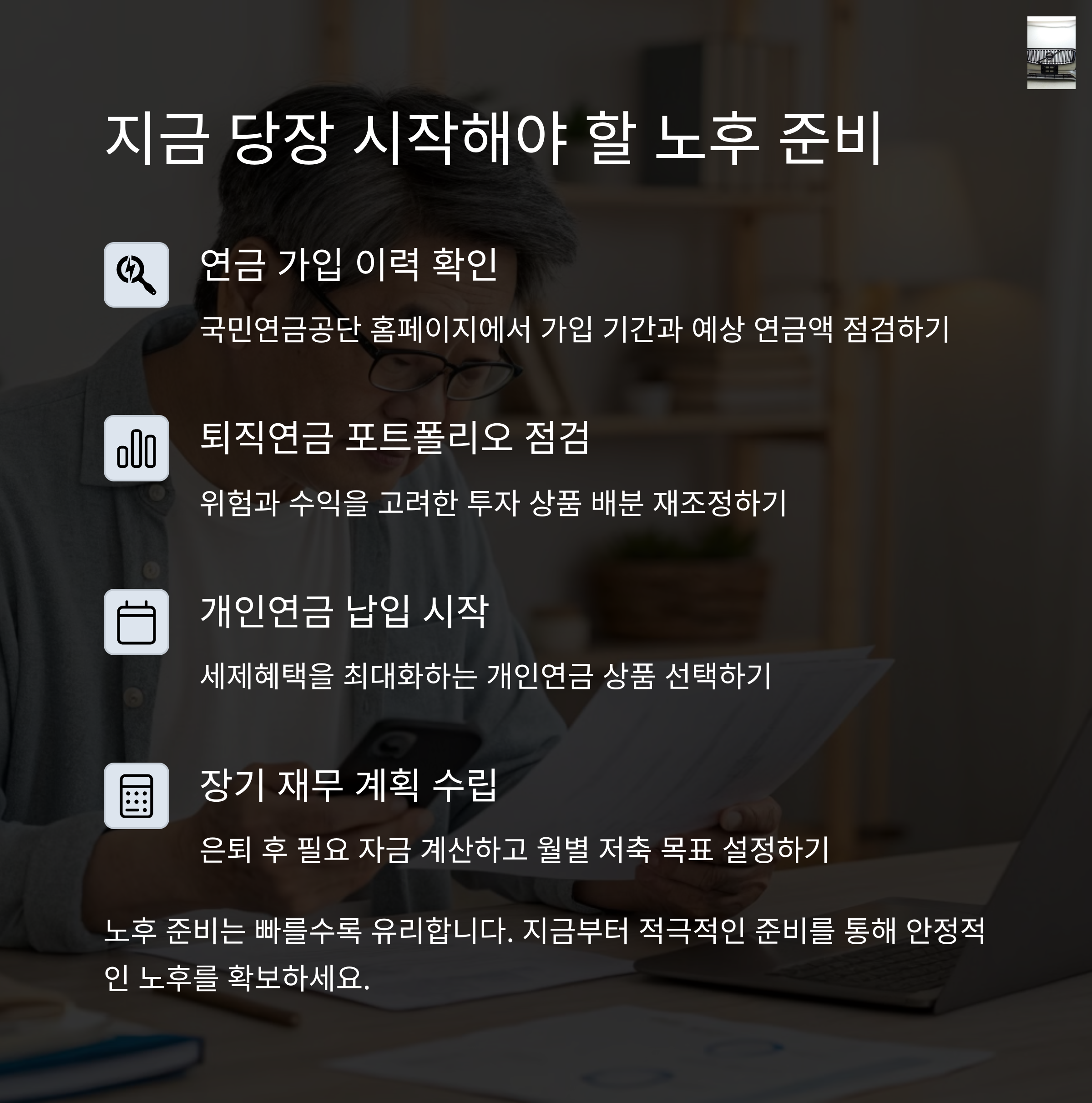 연금 제도는 계속 변화합니다. 하지만 한 가지 확실한 것은 노후 준비는 빠를수록 유리하다는 점입니다. 지금 당장 내 연금 상황을 점검하고, 장기적인 계획을 세워보세요.