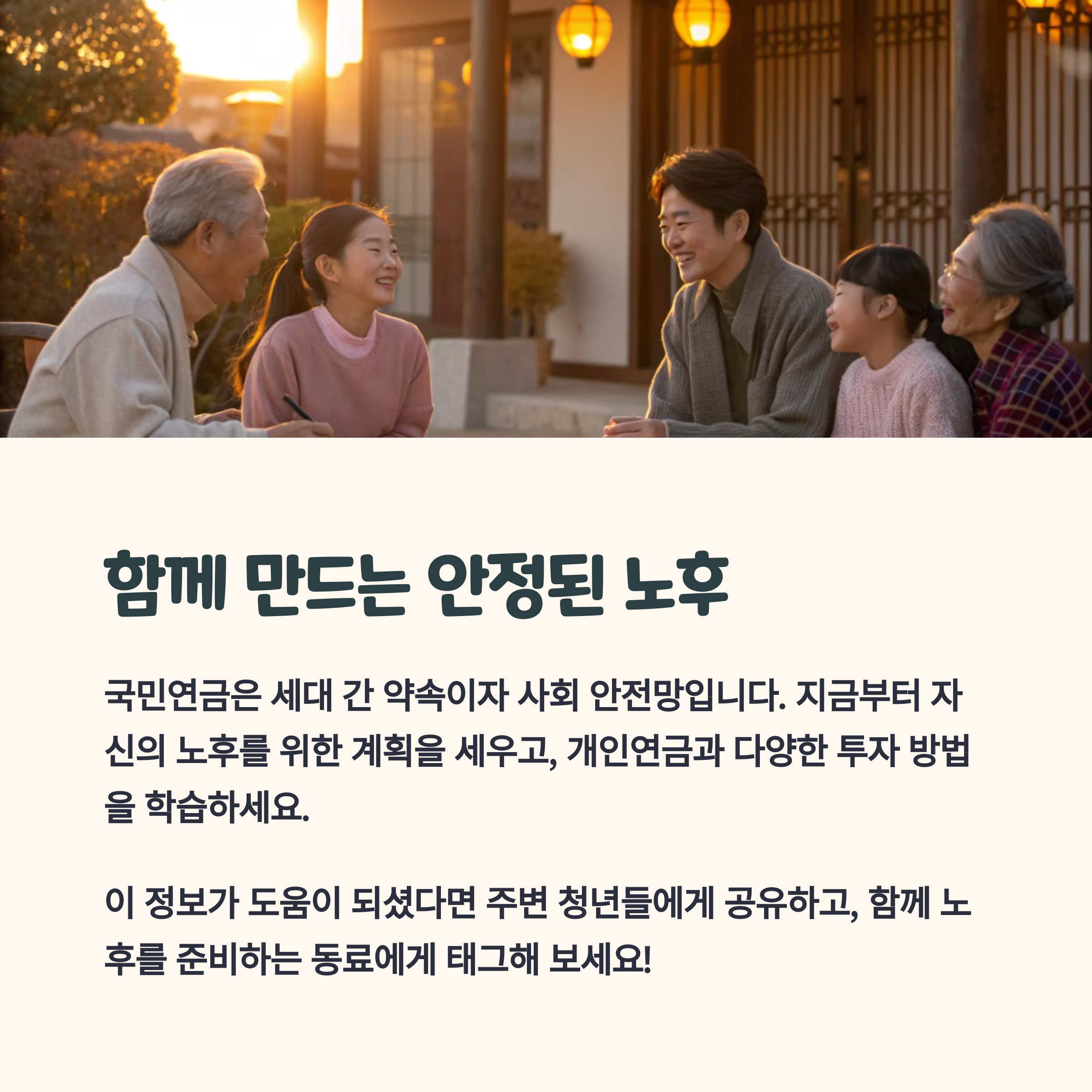 연금은 단순한 저축이 아닌, 세대 간 약속이자 사회 안전망입니다. 청년들이 목소리를 내고 정책에 참여할 때, 더 공정하고 지속가능한 연금 제도가 만들어질 수 있습니다.