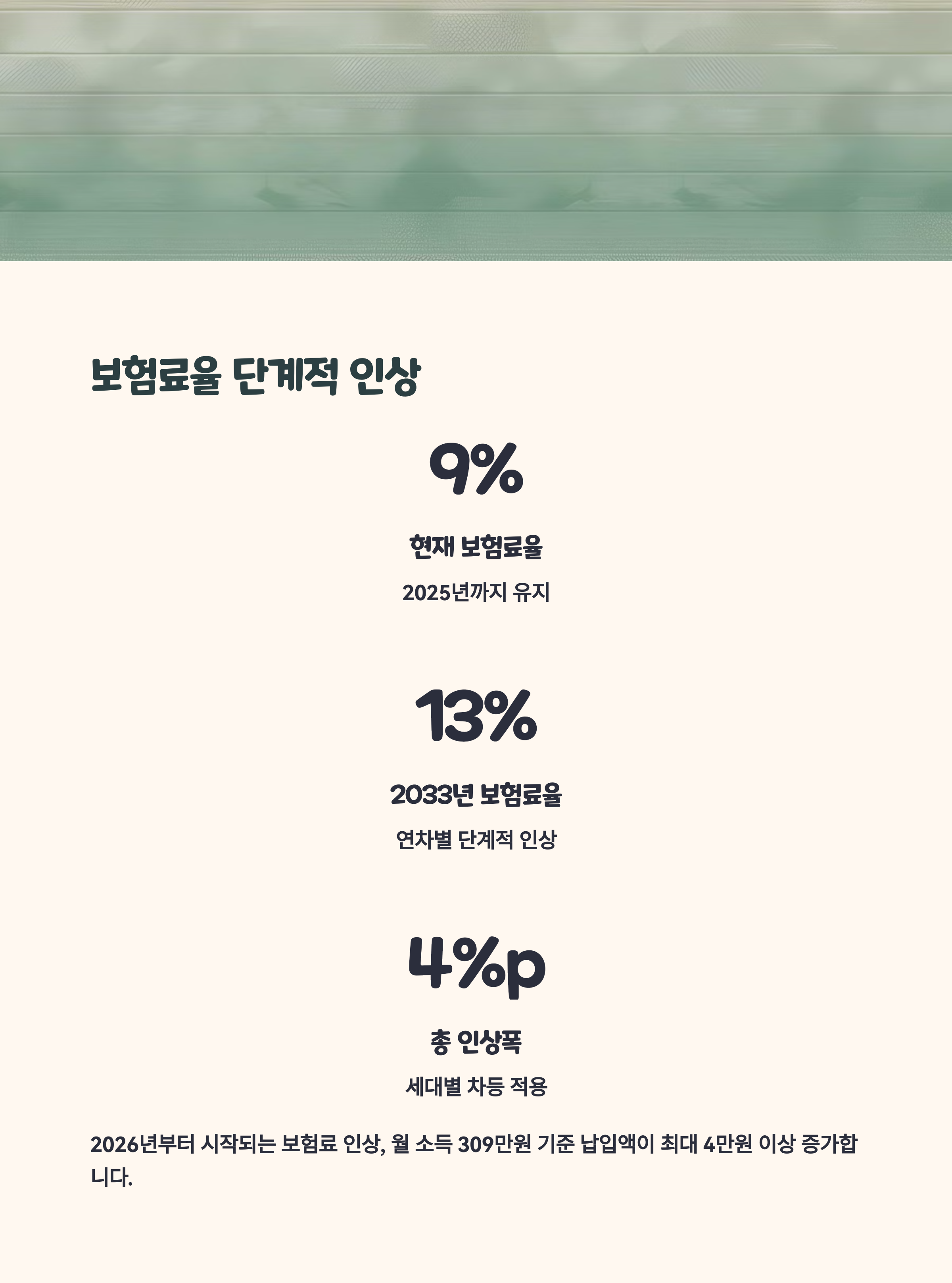- 시행 시점: 2026년부터 기여율 0.5%p씩 매년 인상