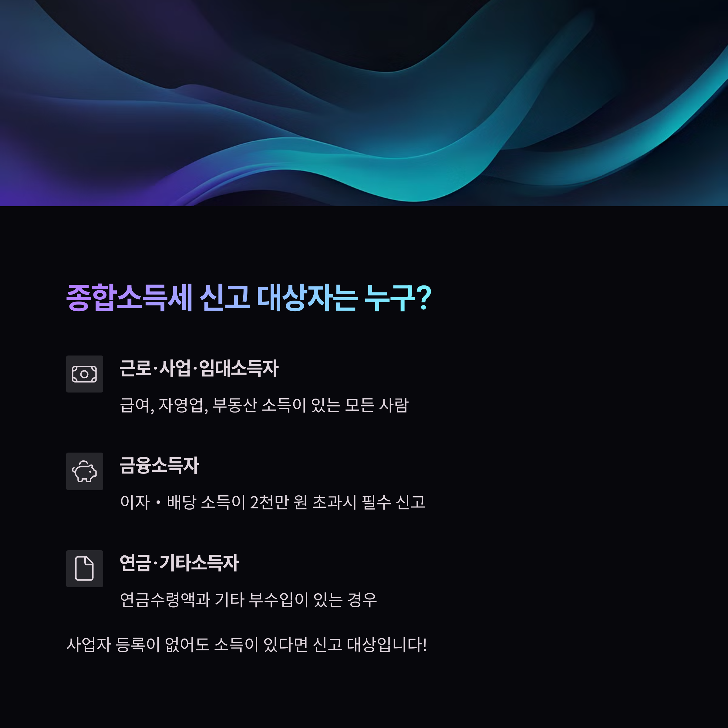임대소득이 있는 임대사업자도 포함되며, 직장인이더라도 이중소득이 있다면 별도 신고가 필수입니다.