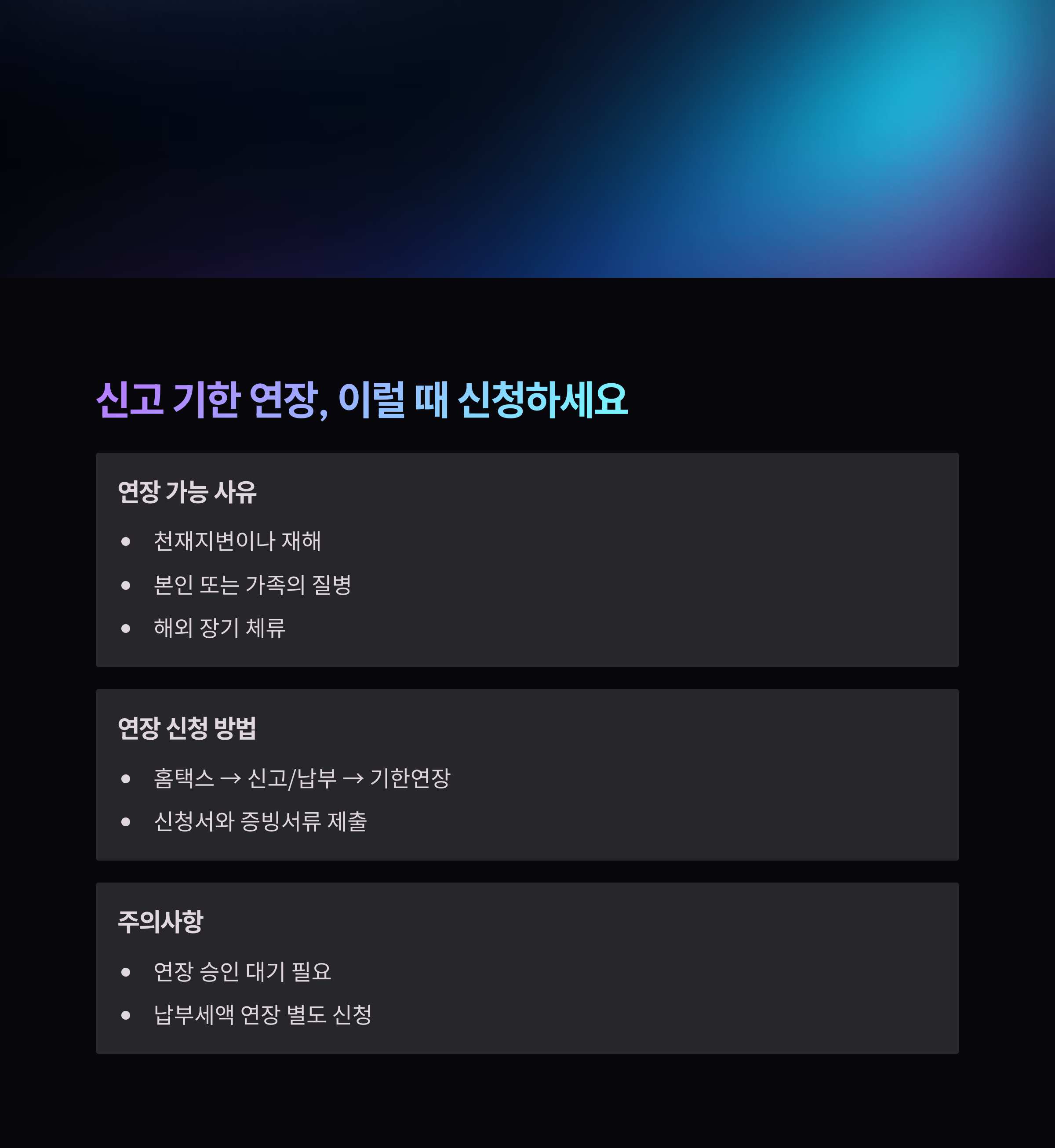 또한, 불가피한 사정이 있는 경우 홈택스를 통해 신고기한 연장 신청이 가능합니다.