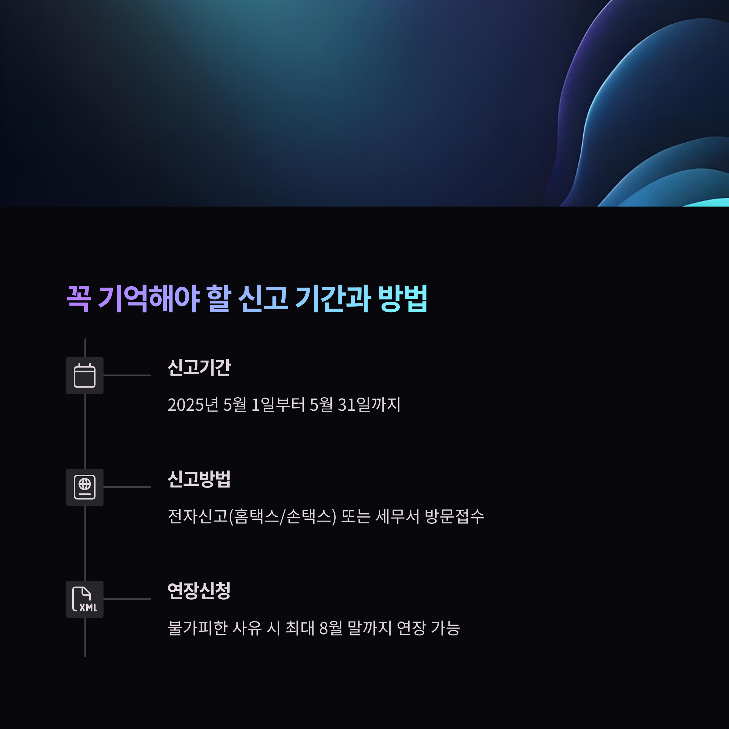 2025년 종합소득세 신고 기간은 5월 1일부터 5월 31일까지입니다.