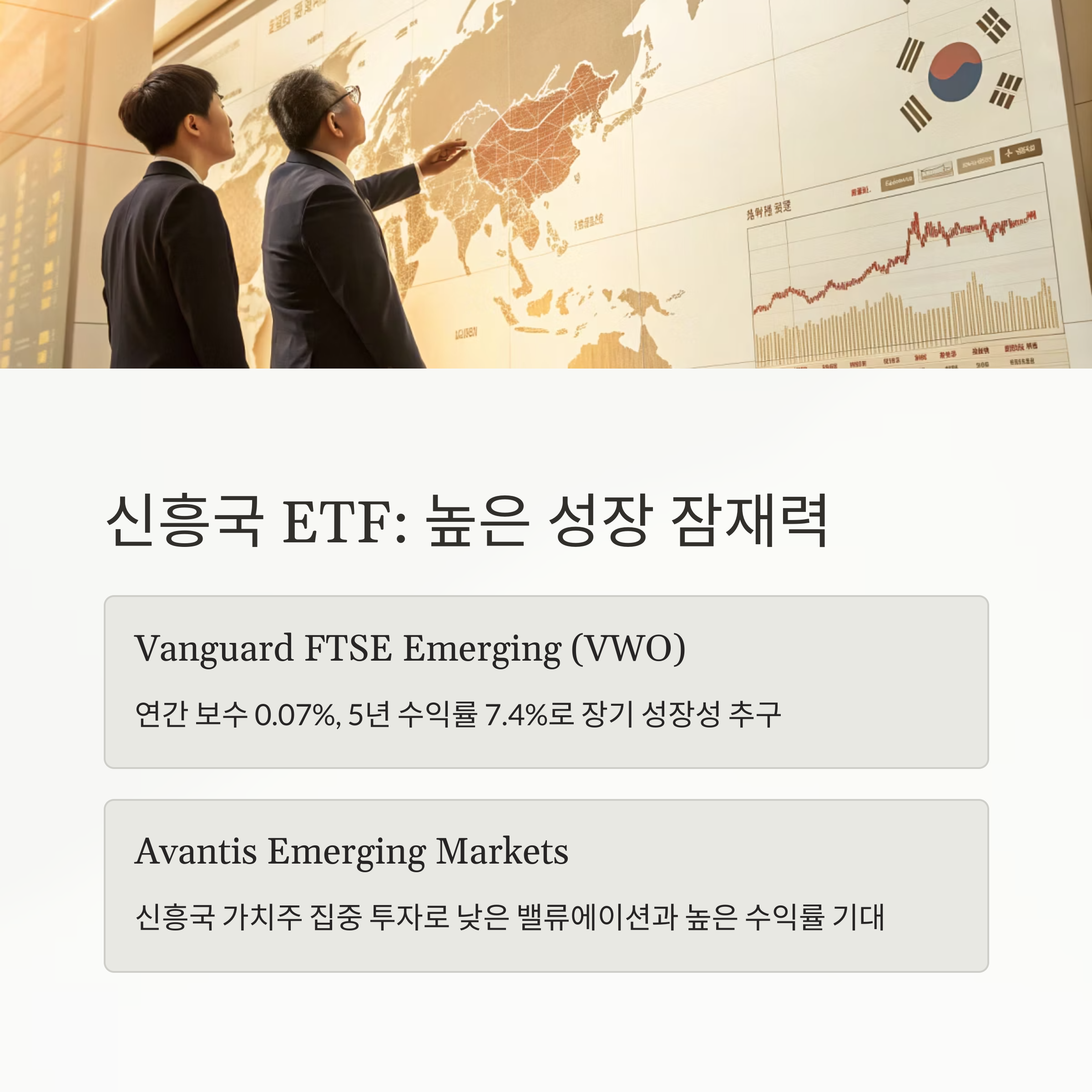 Vanguard FTSE Emerging Markets ETF (VWO)는 신흥국 주식에 분산 투자하며, 연간 보수는 0.07%입니다. 5년 수익률은 7.4%로, 장기적인 성장성을 추구하는 투자자에게 적합합니다.