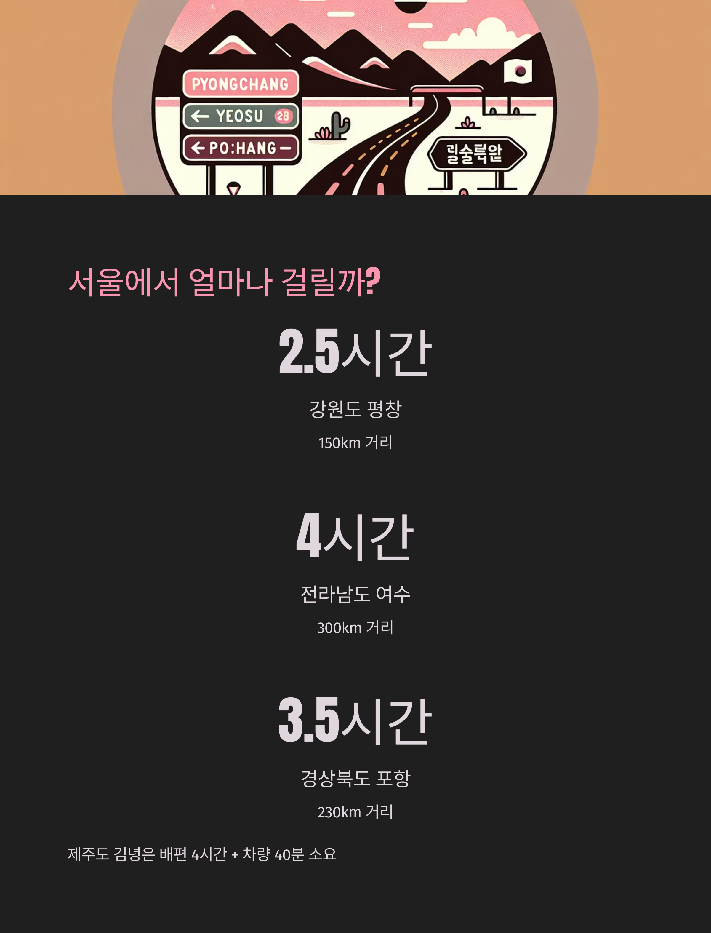 | 경상북도 포항 | 약 3시간 30분 | 230km |