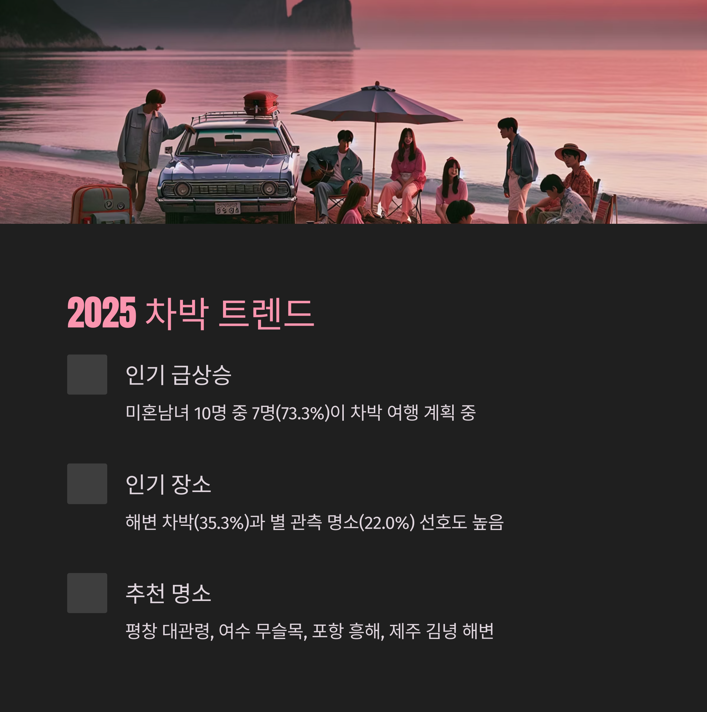 특히 **해변 차박(35.3%)**과 **별이 잘 보이는 명소(22.0%)**가 인기를 끌고 있습니다.