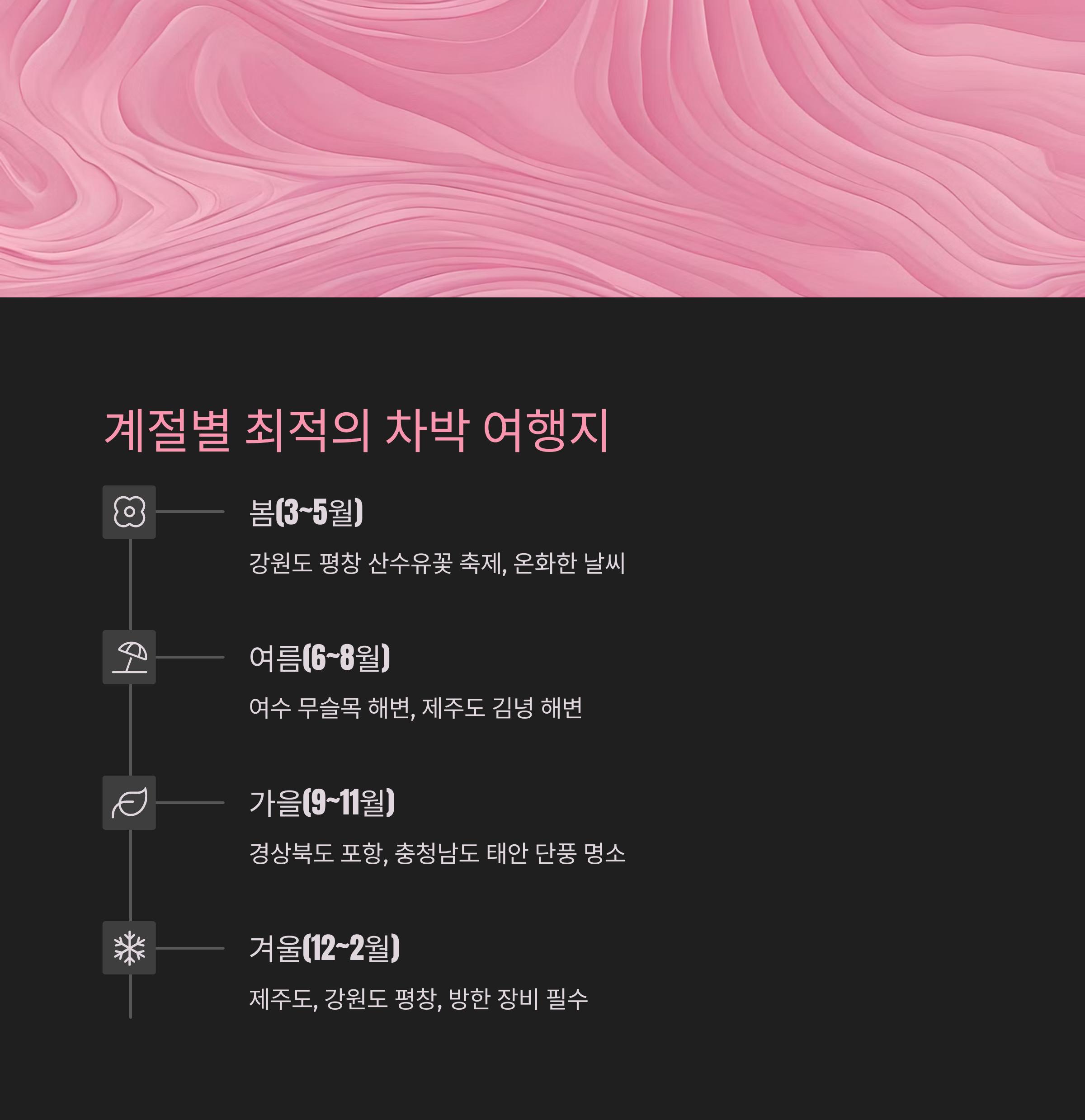 - 가을(9~11월): 단풍 명소로 경상북도 포항, 충청남도 태안 추천