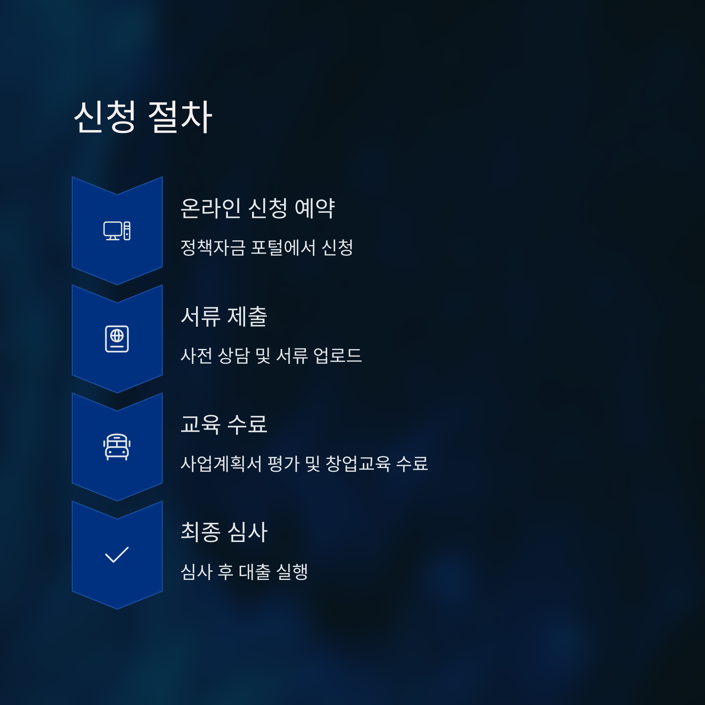 청년사업자대출 신청은 아래 절차에 따라 진행됩니다.